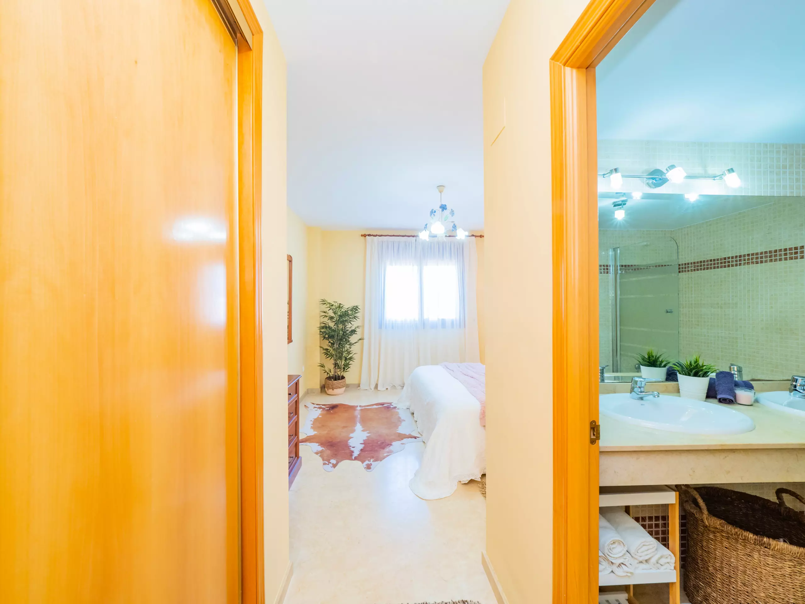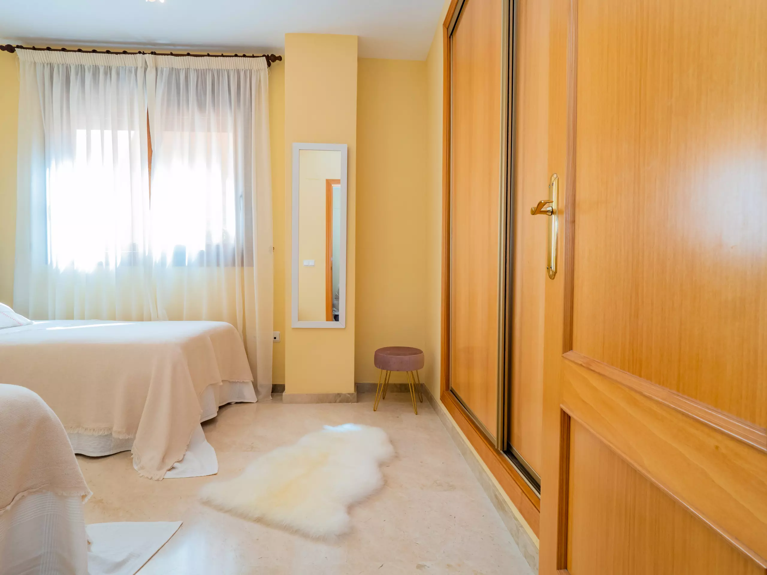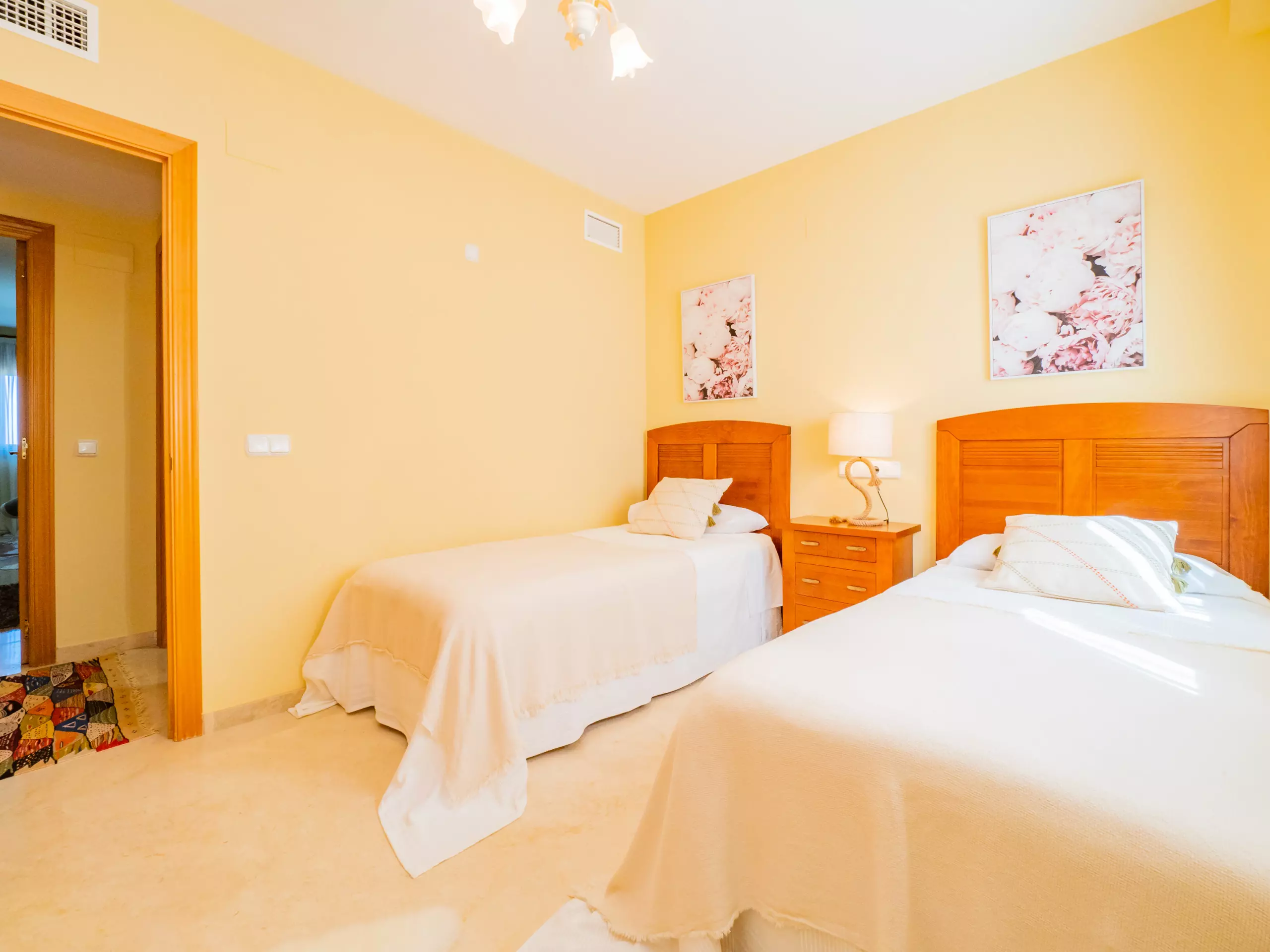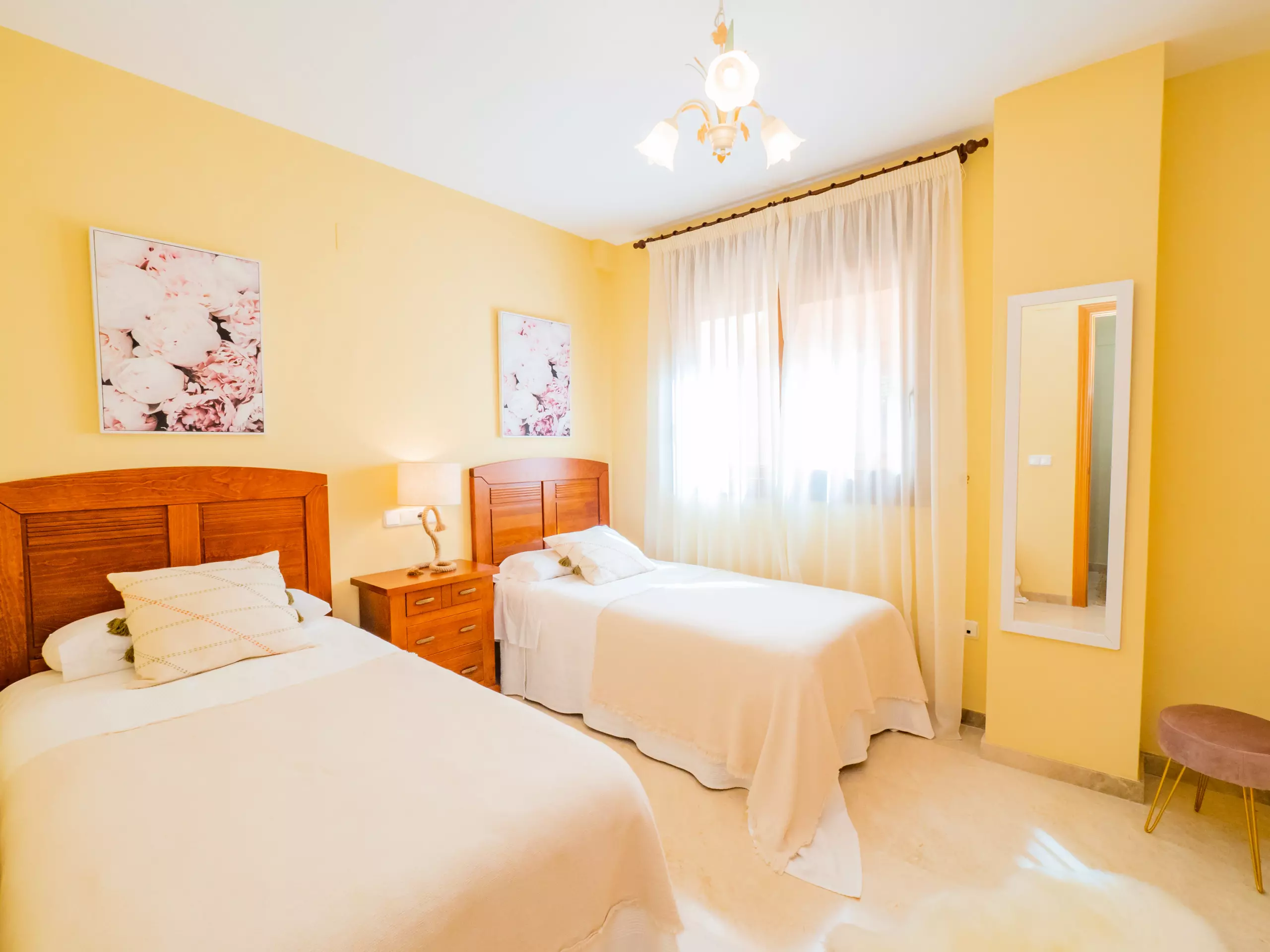 L'appartement dispose de deux chambres pouvant accueillir 4 personnes : une avec un lit de couple et une télévision, et l'autre avec deux lits individuels. Les deux chambres ont des fenêtres donnant sur l'extérieur et suffisamment d'espace pour ranger les bagages. La salle de bain complète comprend une baignoire. La climatisation centralisée garantit un confort tout au long de l'année. De plus, le logement dispose du wifi et d'une place de parking couverte incluse dans le même bâtiment.