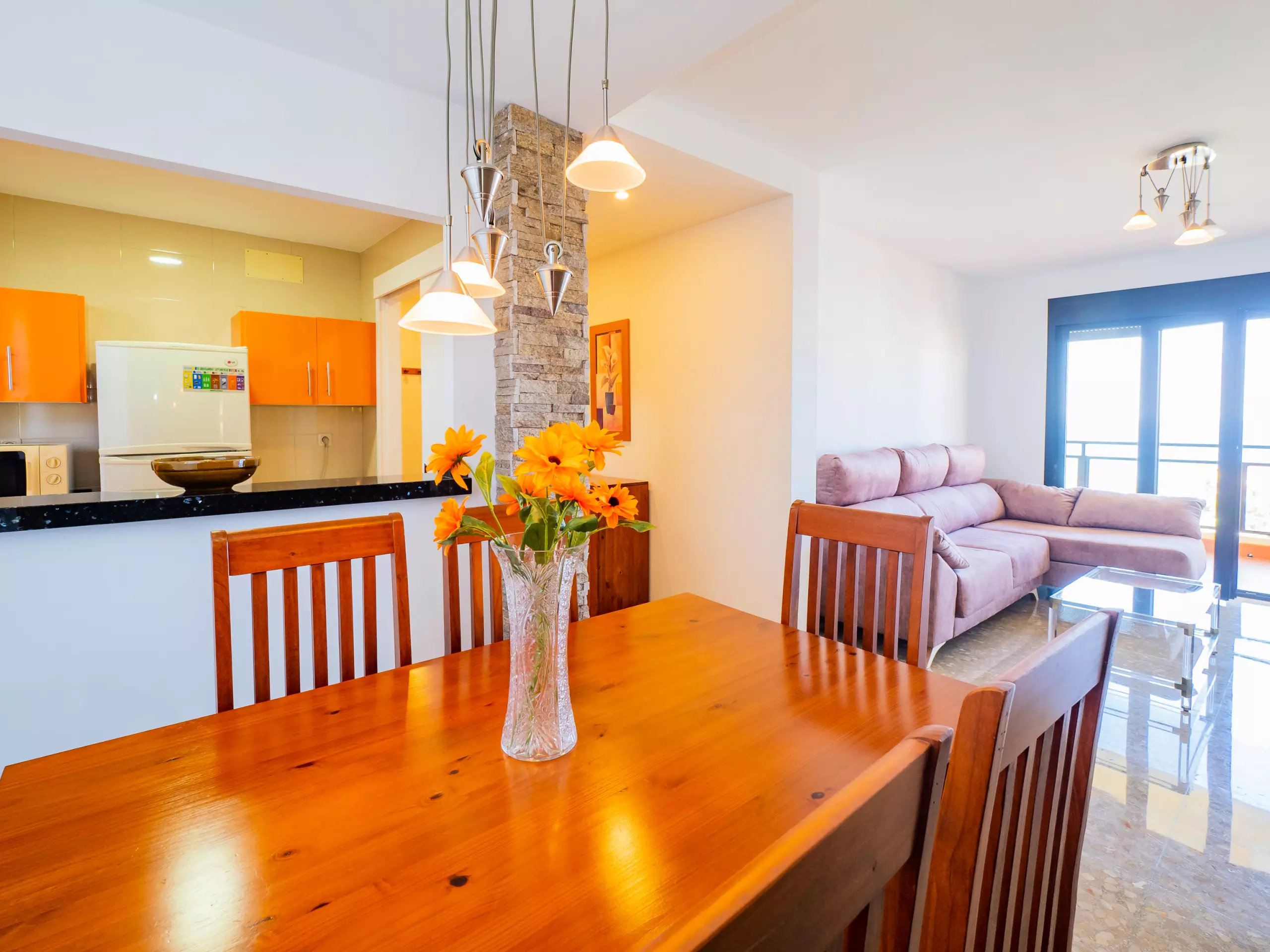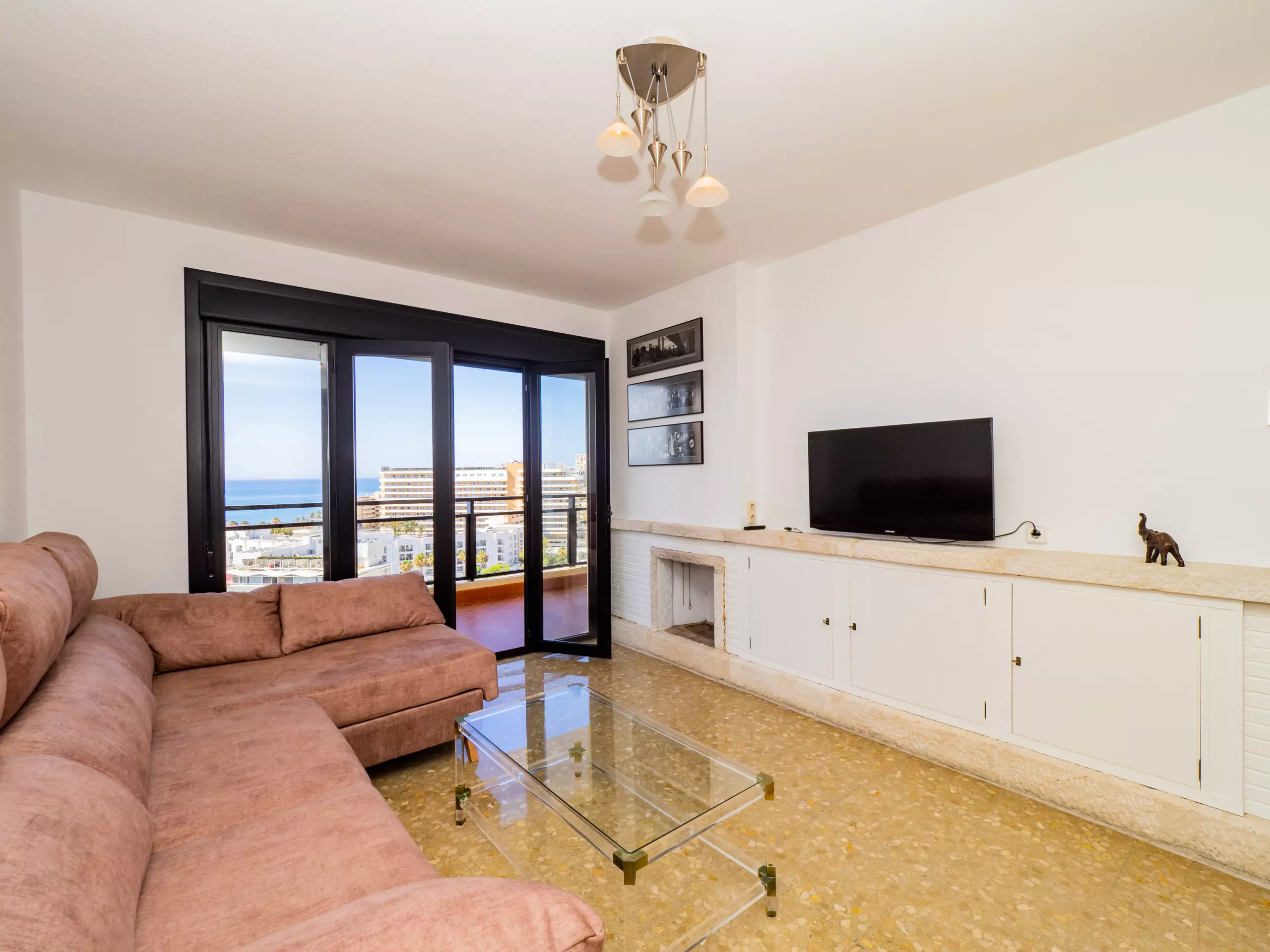 L'appartement se distingue par sa terrasse de 8 m² avec mobilier extérieur, depuis laquelle vous pourrez profiter des magnifiques vues sur la mer et la montagne. Le salon-salle à manger, spacieux et lumineux, dispose d'un canapé, d'une télévision et d'une table familiale en bois pour partager des moments inoubliables. La cuisine américaine est entièrement équipée avec une plaque vitrocéramique, un réfrigérateur, un micro-ondes, un four, un congélateur, un lave-linge et de petits électroménagers tels qu'une cafetière, un grille-pain et un presse-agrumes, facilitant la préparation de tous vos repas.
