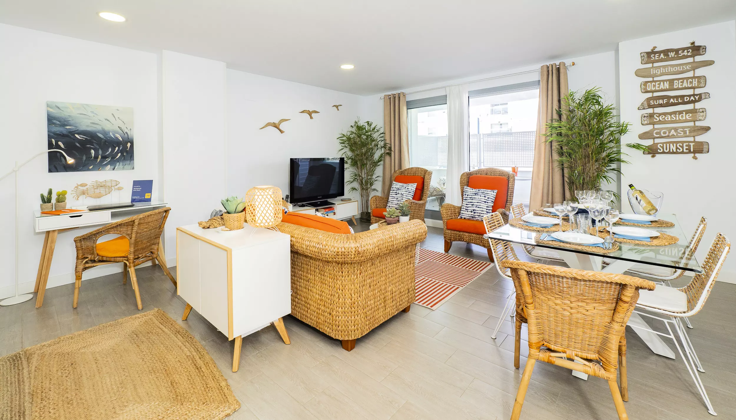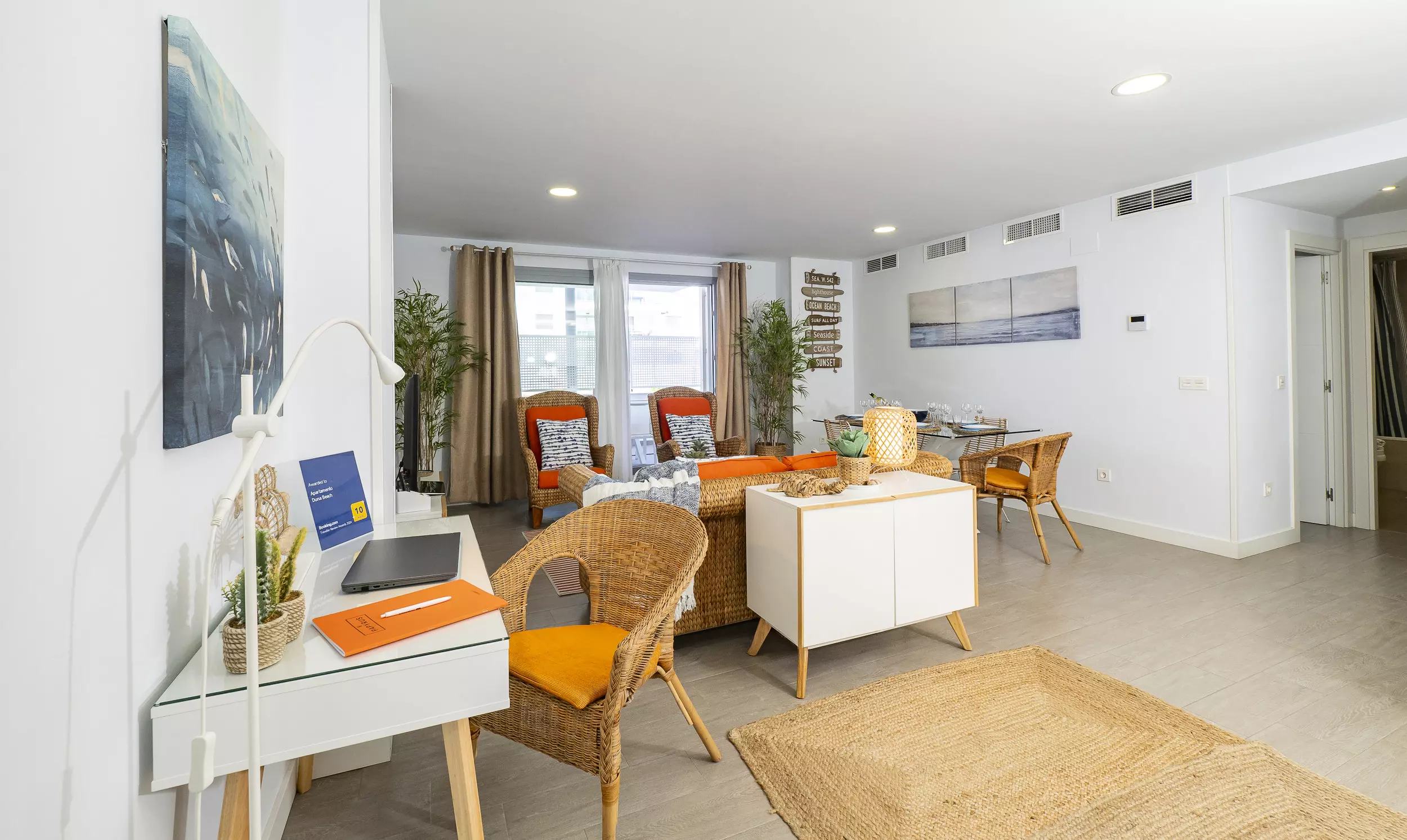 Le salon-salle à manger est lumineux et accueillant, avec un mobilier confortable, un bureau idéal pour le télétravail et un accès direct à la terrasse, parfaite pour se détendre ou partager des repas en plein air.