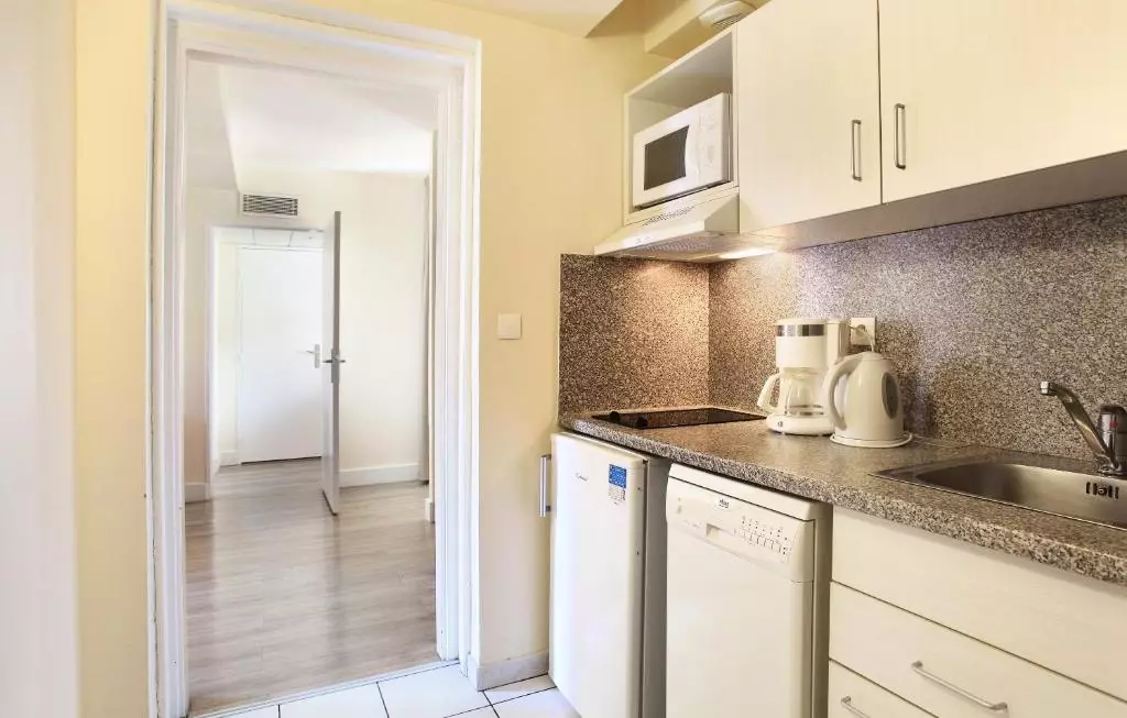 L'équipement comprend des plaques vitrocéramiques, un lave-vaisselle, un réfrigérateur, un micro-ondes, une hotte aspirante et un sèche-serviettes.