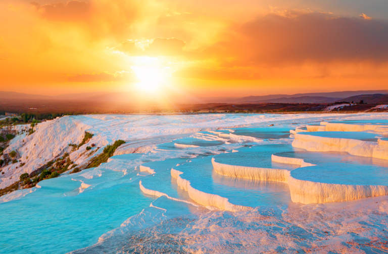 Après le petit déjeuner, route pour Pamukkale pour visiter l’ancienne Hiérapolis et le château de coton, une véritable merveille naturelle d’une blancheur éclatante où le ruissellement des sources d’eau chaude, saturées en sels calcaires a tapissé la falaise, créant ainsi d’impressionnants stalactites et piscines naturelles.