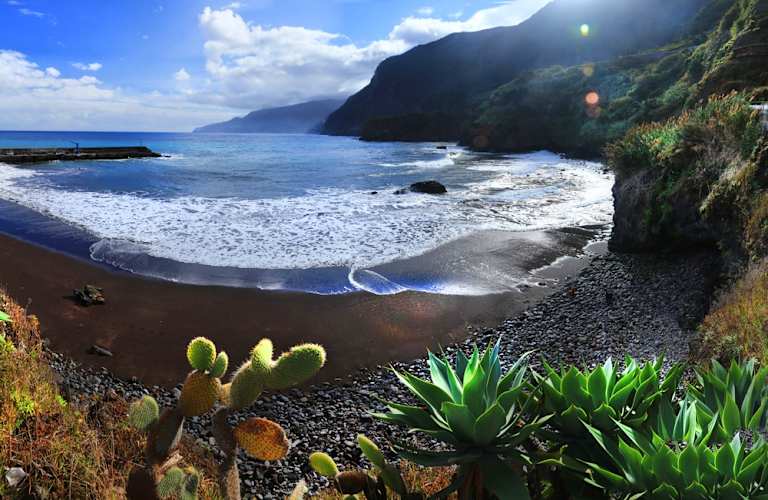Par le col de Poiso et Santo da Serra, vous redescendrez sur Machico, deuxième plus importante ville de l’île. C’est à cet endroit que l’île de Madère fut découverte en 1419. À quelques kilomètres de là se trouve le village de pêcheurs de Caniçal, où l’on pêchait jadis les baleines. Les barques multicolores des pêcheurs d’aujourd’hui sortent la nuit pour capturer l’espada, le sabre-congre, à de très grandes profondeurs, entre 900m et 1 800m. Un arrêt à la Ponta de São Lourenço s’impose. C’est le point le plus à l’est de l’île de Madère. La plage de Prainha, toute en sable volcanique, vous tend les bras ! Si vous avez le temps, une belle randonnée, de force moyenne, comprenant des dénivelés positifs et négatifs de 400m, et d’une durée d’environ 3 heures, vous conduira de la route au bord de mer. Au loin, vous apercevrez l’ile de Porto Santo.