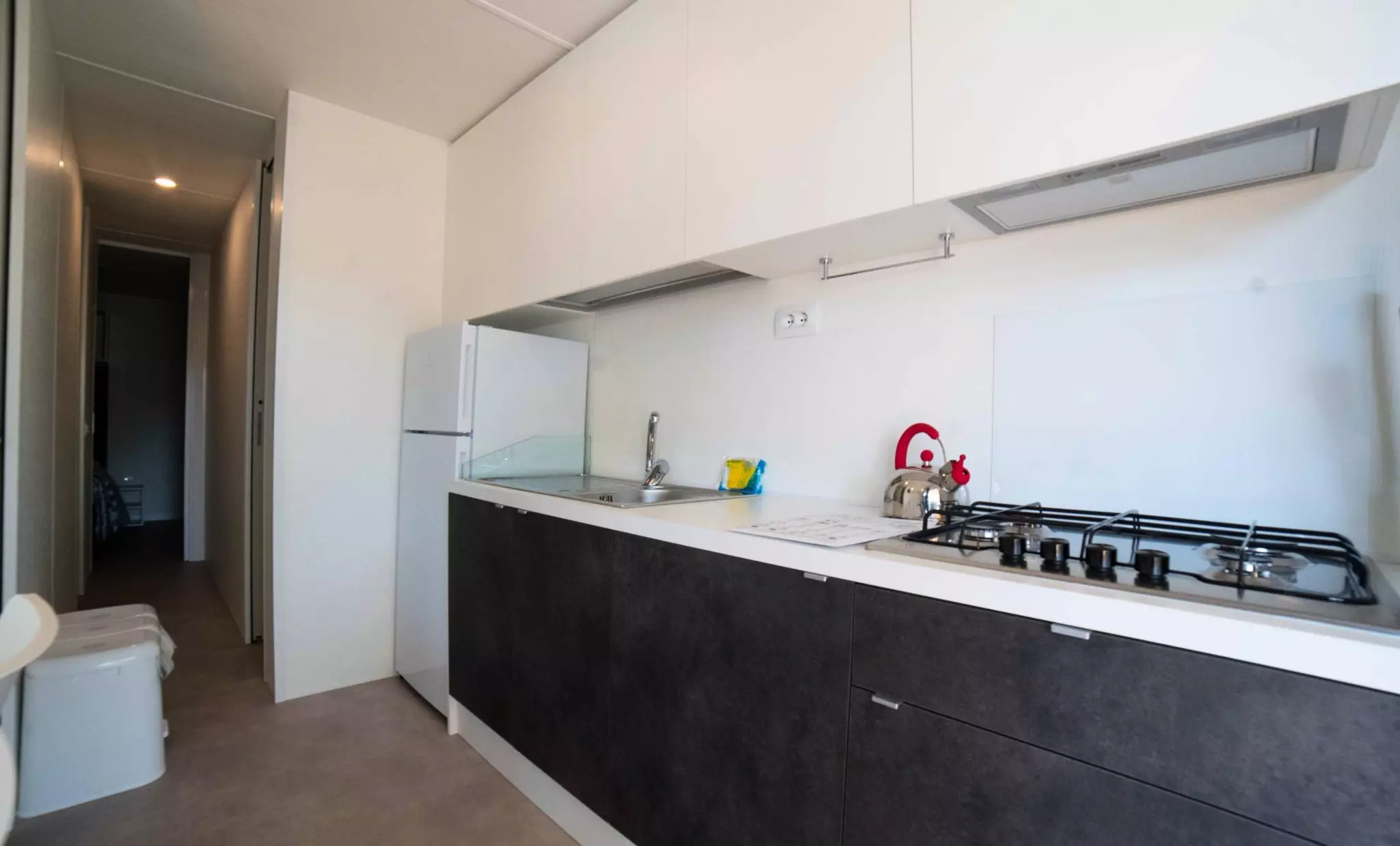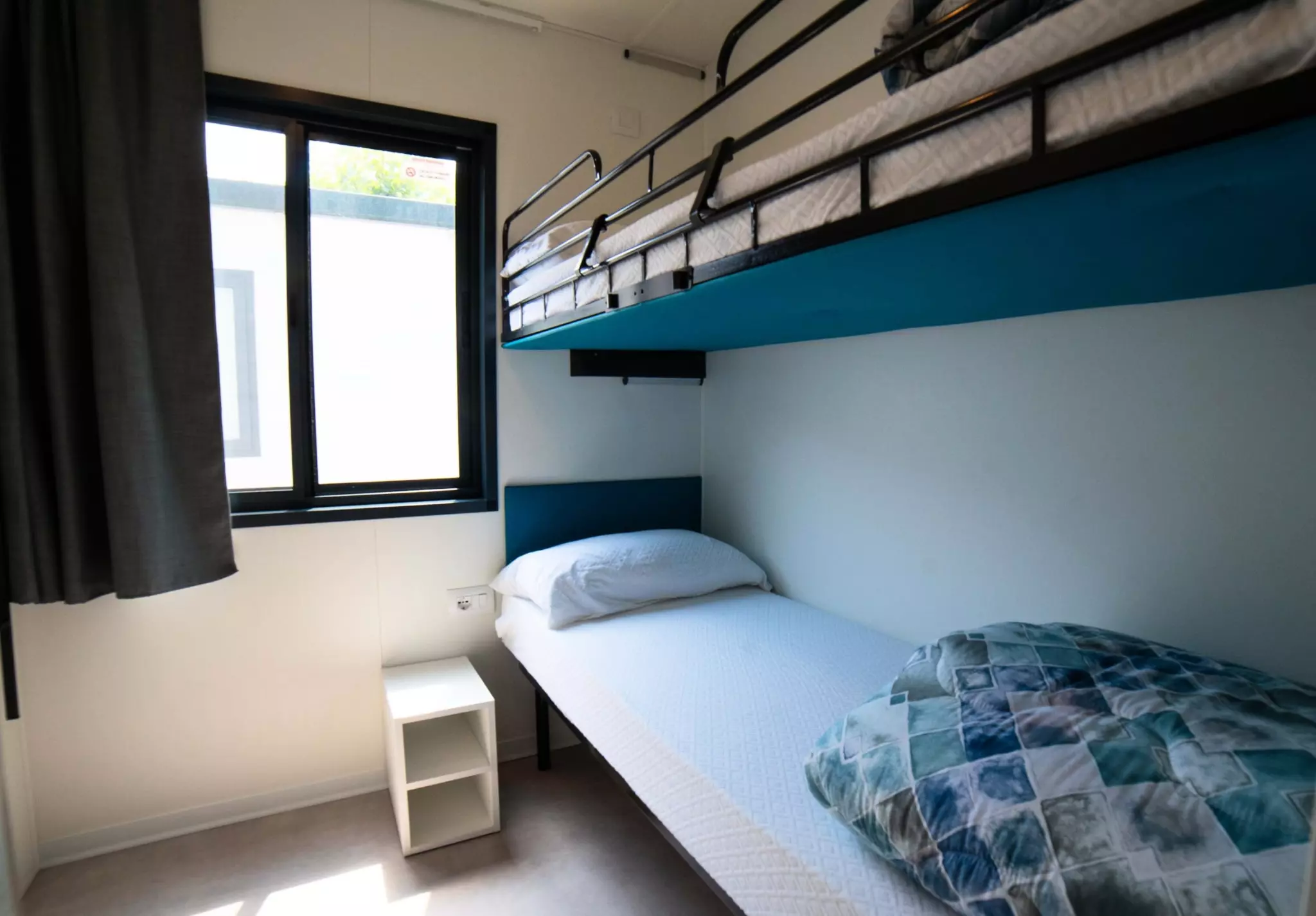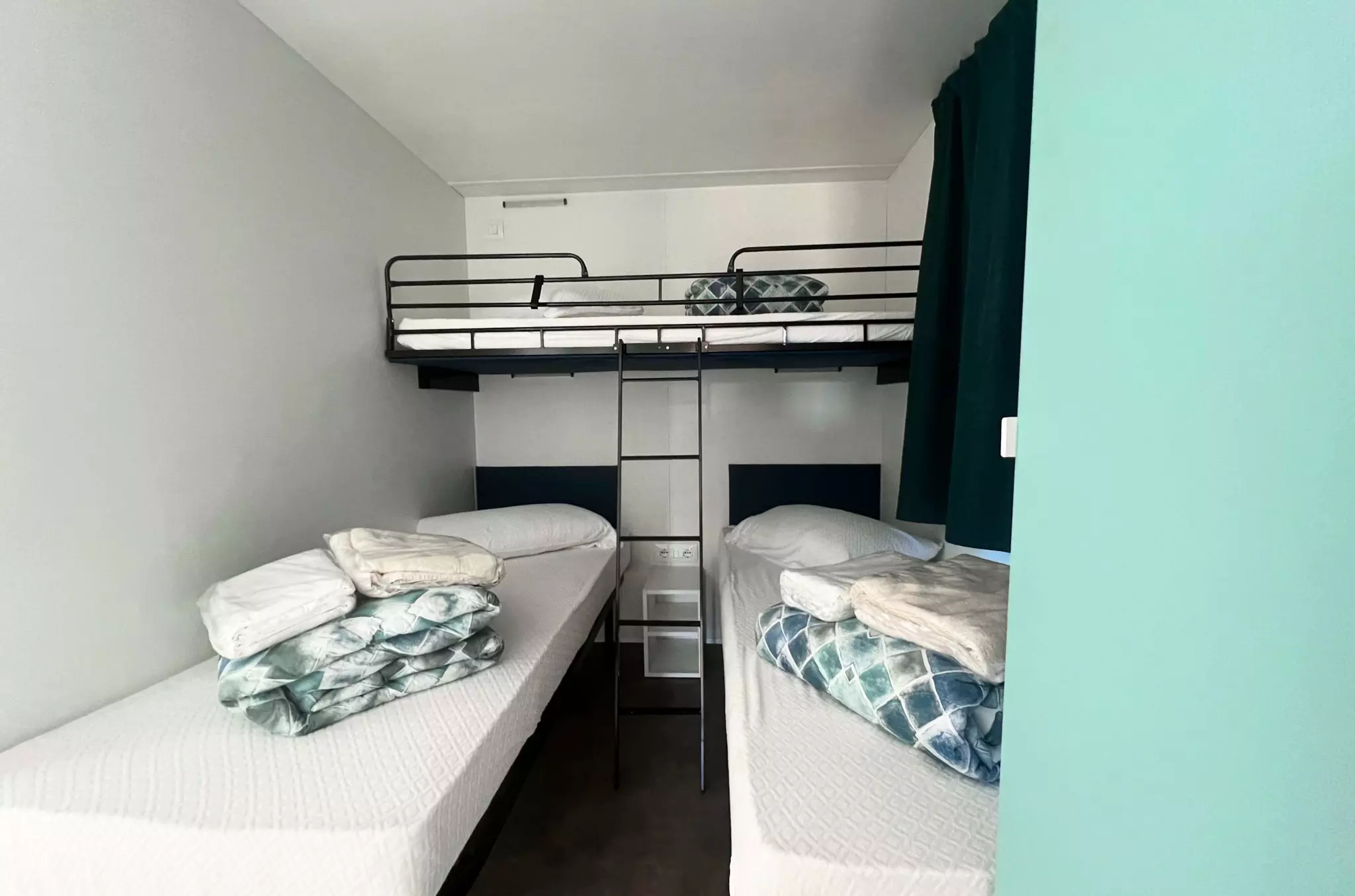 The sleeping area has one double bedroom and a second bedroom with three single beds, one of which is elevated, ideal for children.