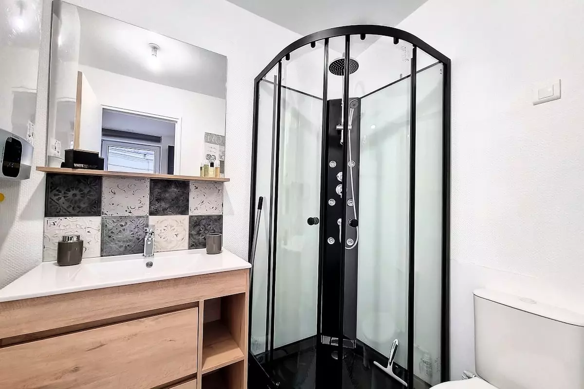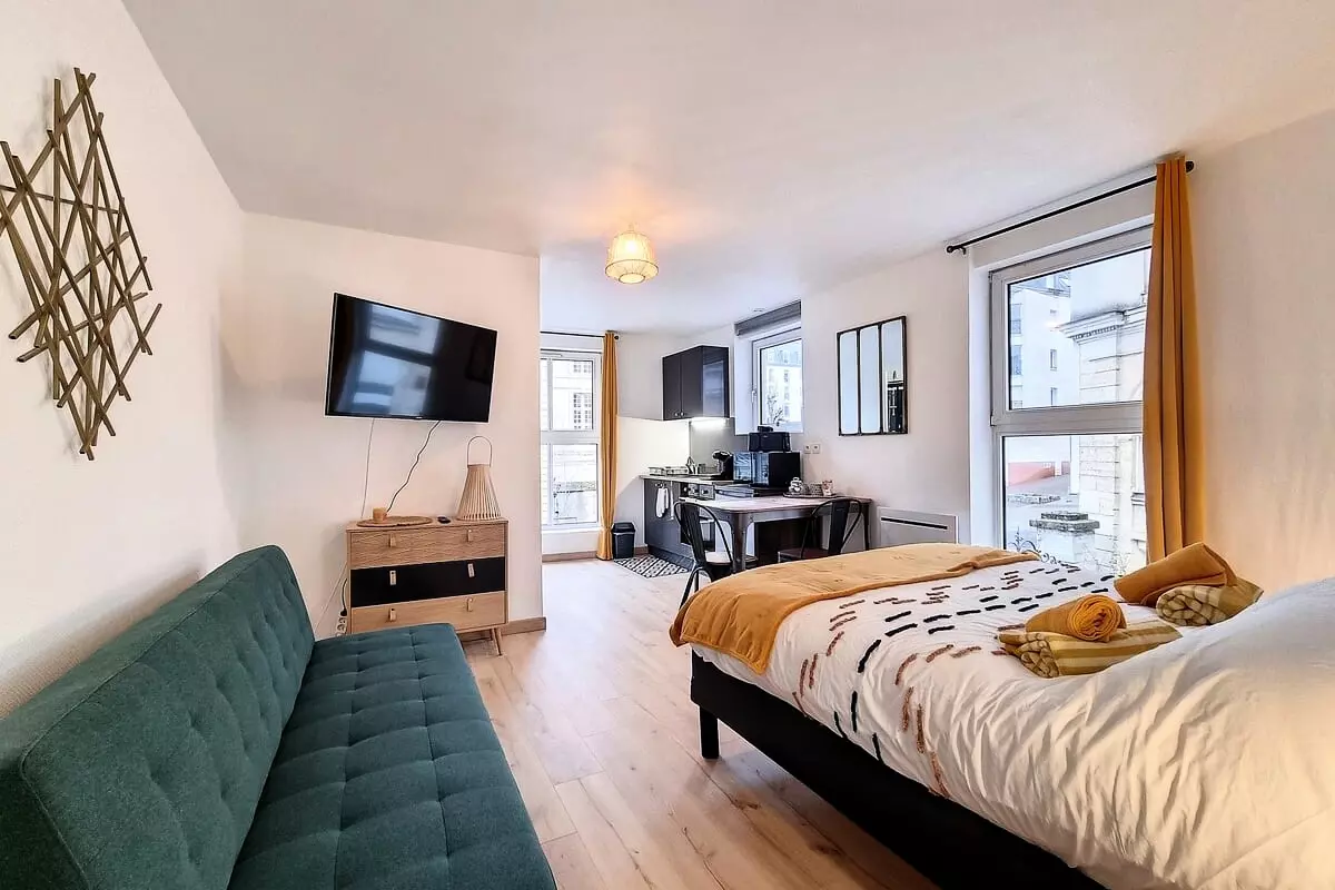 À l’intérieur, l’appartement offre une atmosphère moderne, épurée et chaleureuse, pensée pour un séjour fluide et confortable. Le salon, lumineux et agréable, vous permet de profiter d’une vue sur la Préfecture : parfait pour se poser en fin de journée, regarder un film sur la Smart TV, ou organiser vos visites grâce à la connexion Wi-Fi.