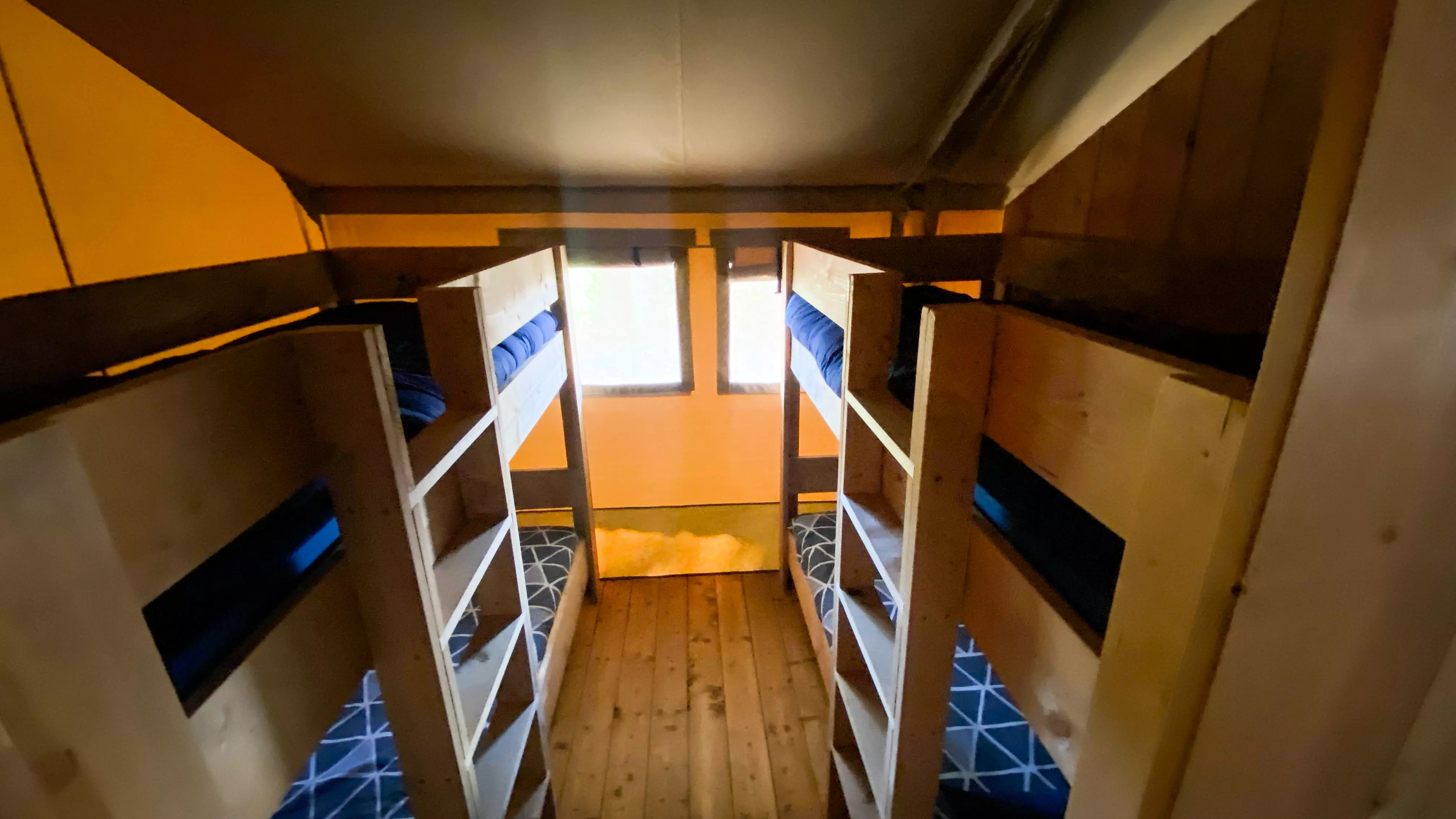 À l'intérieur, vous trouverez une cuisine entièrement équipée avec tous les ustensiles nécessaires. La cuisine dispose d'un réchaud à gaz à quatre feux sécurisé, facilement déplaçable à l'extérieur, vous permettant de cuisiner agréablement en plein air. De plus, il y a un réfrigérateur, une cafetière et une bouilloire. La tente safari offre un espace de couchage pour 8 personnes, réparties sur trois chambres séparées. Dans la première chambre se trouve un lit double de 160x200 cm. La deuxième chambre est aménagée avec deux lits superposés de 80x200 cm, et dans la troisième chambre, vous trouverez un lit superposé supplémentaire. Tous les lits sont équipés de bons matelas, afin que chacun puisse profiter d'un sommeil confortable. Les photos utilisées sont des photos marketing. La réalité peut différer.
