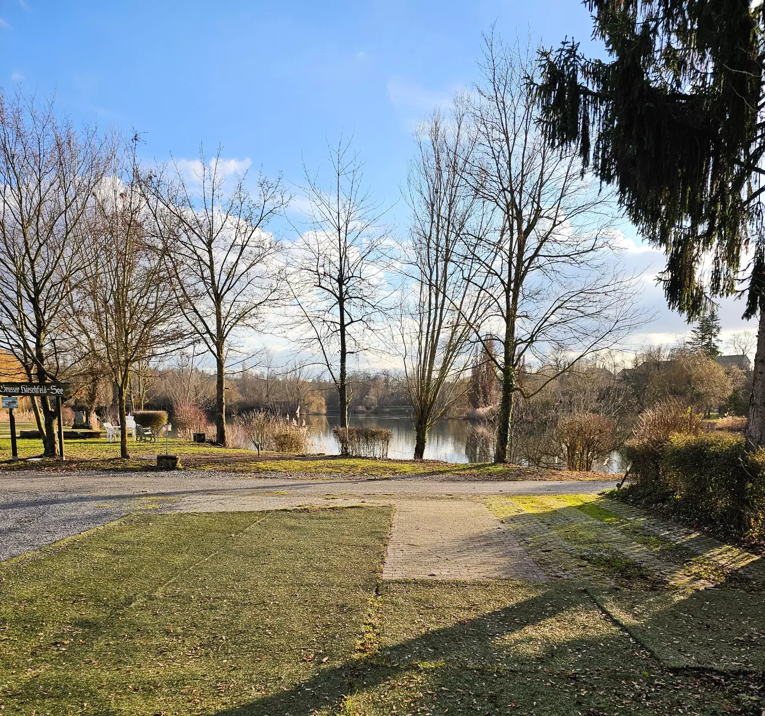 Stellplatz mit Fahrspur und Terrasse mit lauschigem Blick auf den Angelsee.