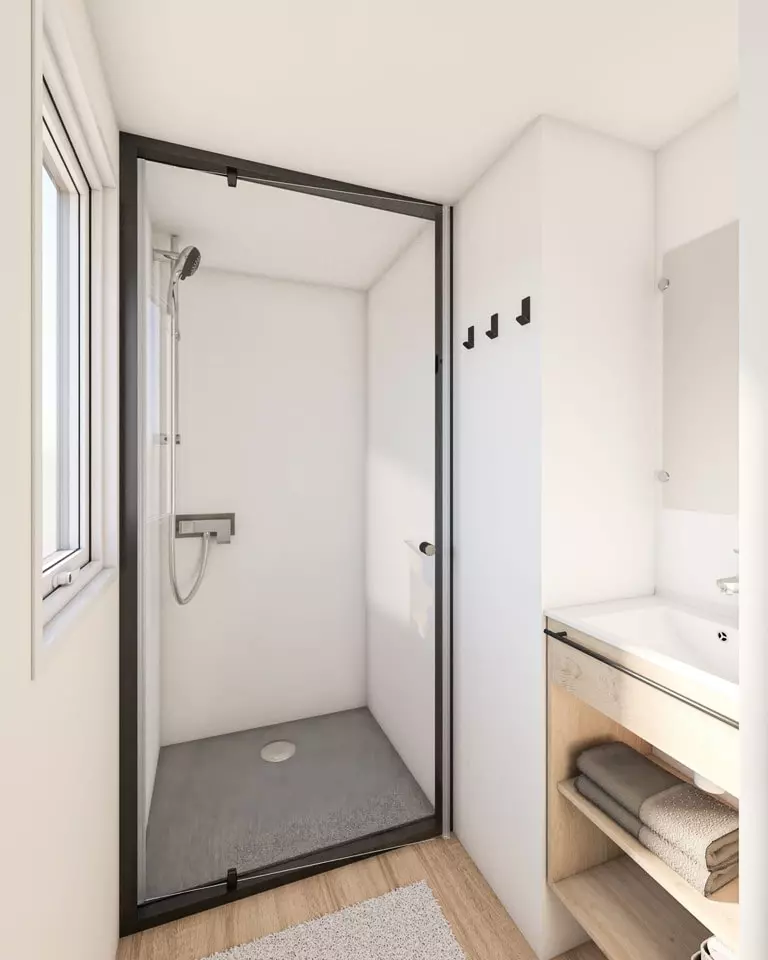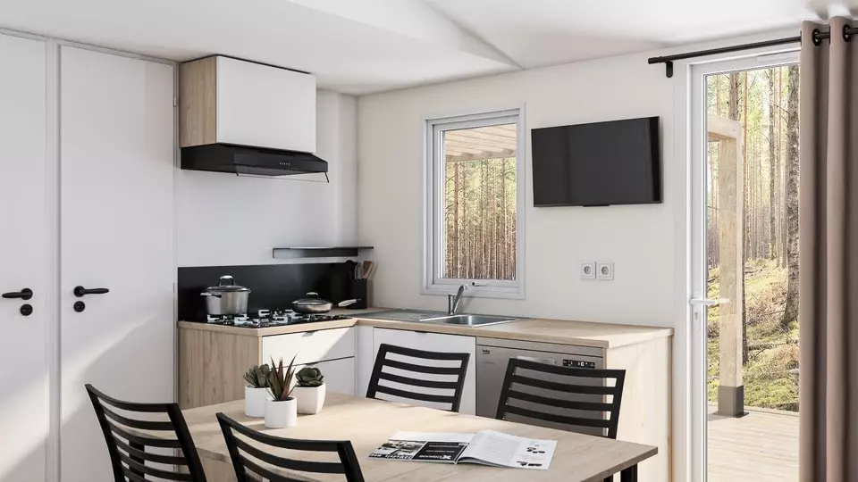 Ce mobil home Trigano 3 chambres permet de profiter d'une agréable cuisine toute équipée (y compris le lave-vaisselle), d'un téléviseur dans le salon et de nombreux rangements dans les chambres. Il est le logement rêvé de tous les vacanciers, qu'ils viennent en famille ou entre amis, avec son intérieur contemporain et ses espaces parents et enfants distincts. La salle de bain est équipée d'une grande douche et les toilettes sont séparées.