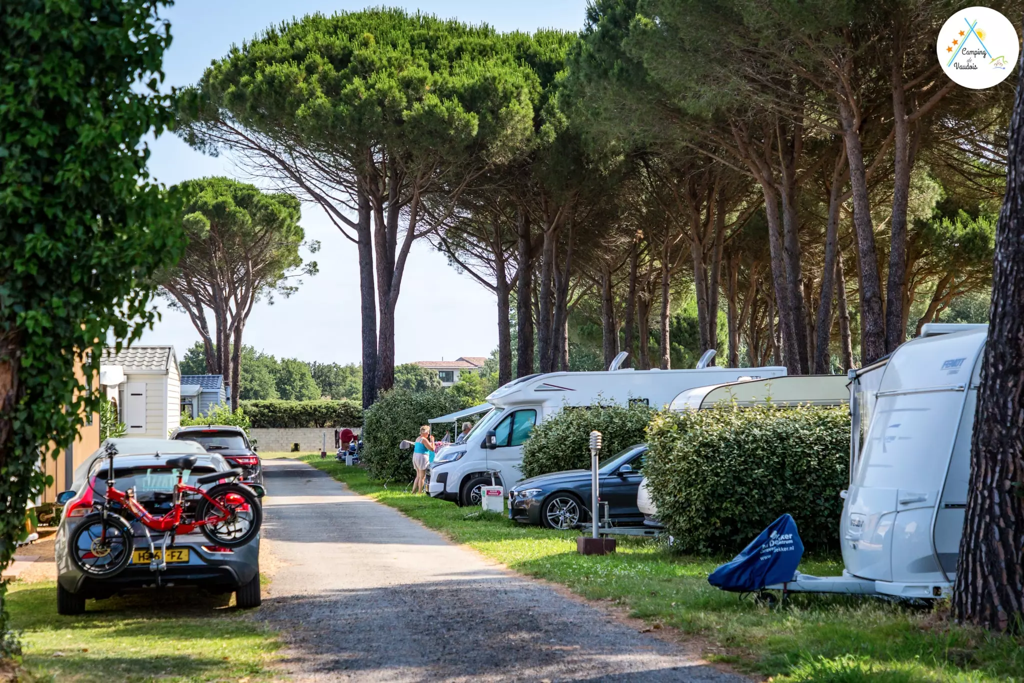Camping familial. Dans un cadre de verdure, savourez l'espace, le calme, le confort, sur un terrain plat avec des emplacements ombragés délimités. La mer à environ 10mn en vélo par une piste cyclabe. Accès Wi-fi gratuit.