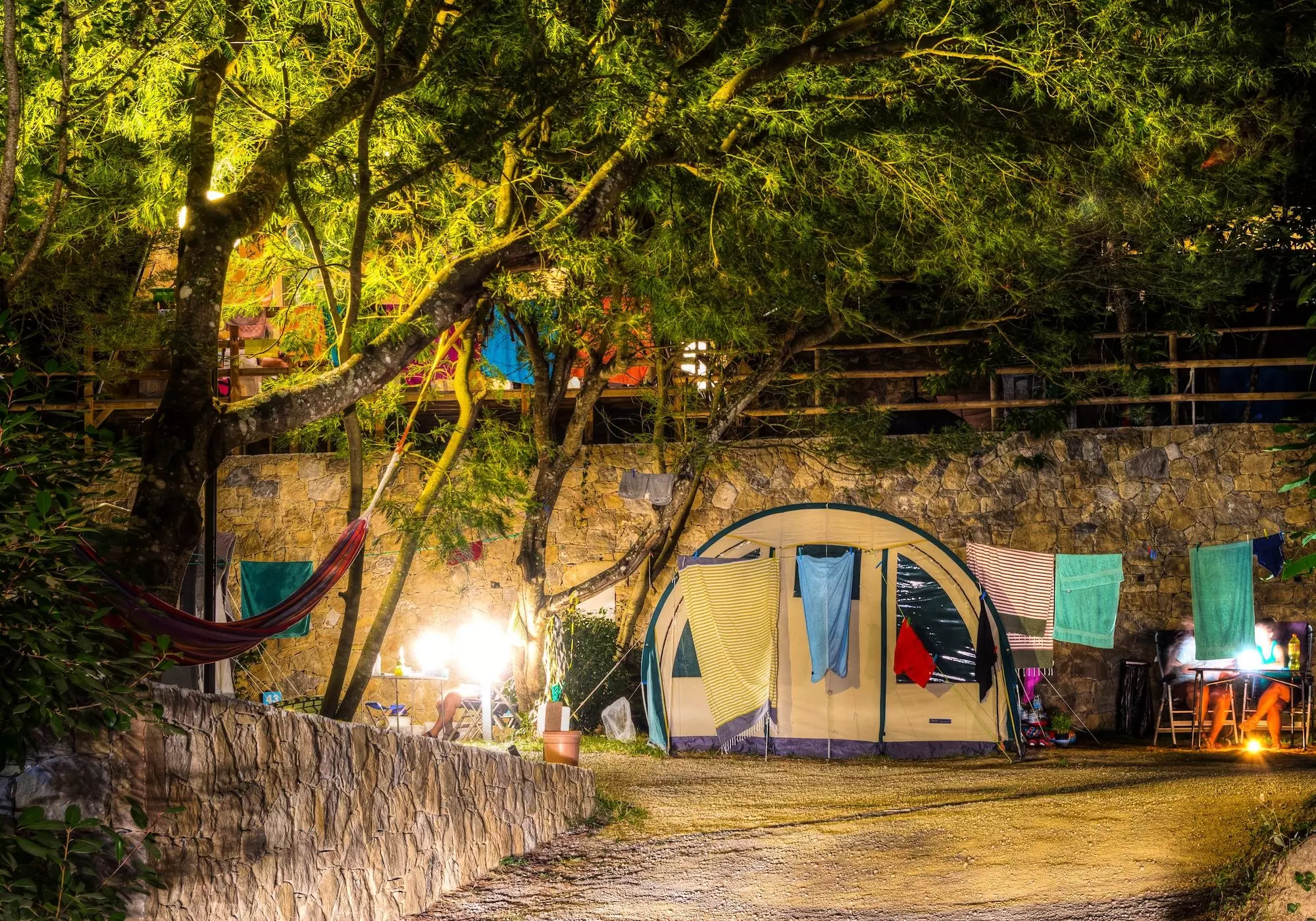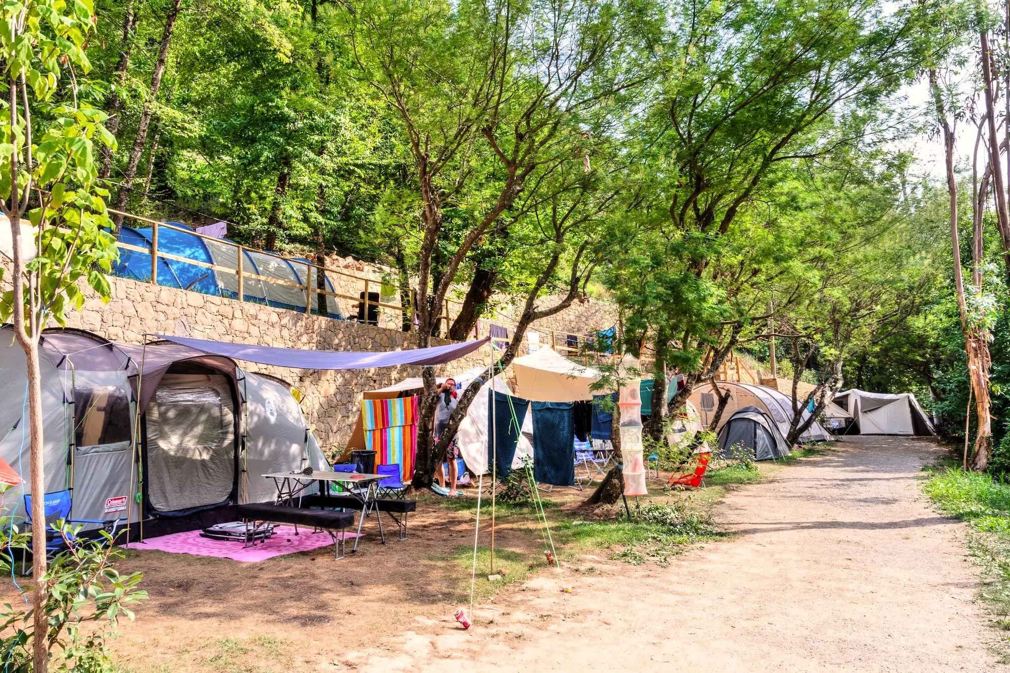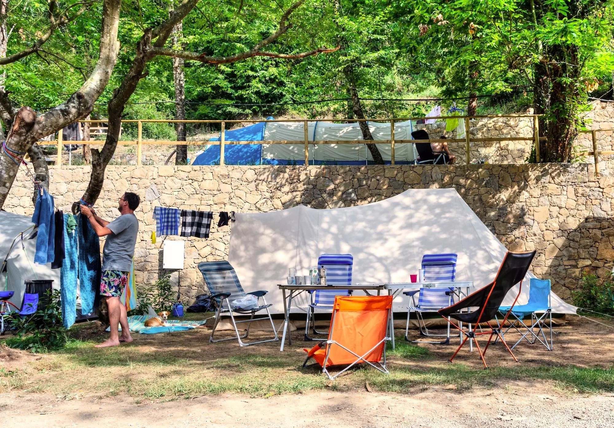 Les sites de tente jaune pour petits tentes et tentes moyenne sont situés sur des terrasses vertes avec des murs de pierre sur la pente de montagne. Les emplacements donnent sur les montagnes de la vallée de Nervia et l'imposant Monte Torraggio. Toutes les emplacements sont équipées d'une alimentation de 3 ampères. Une place de parking est incluse dans le prix, le parking au camping n'est pas autorisé.