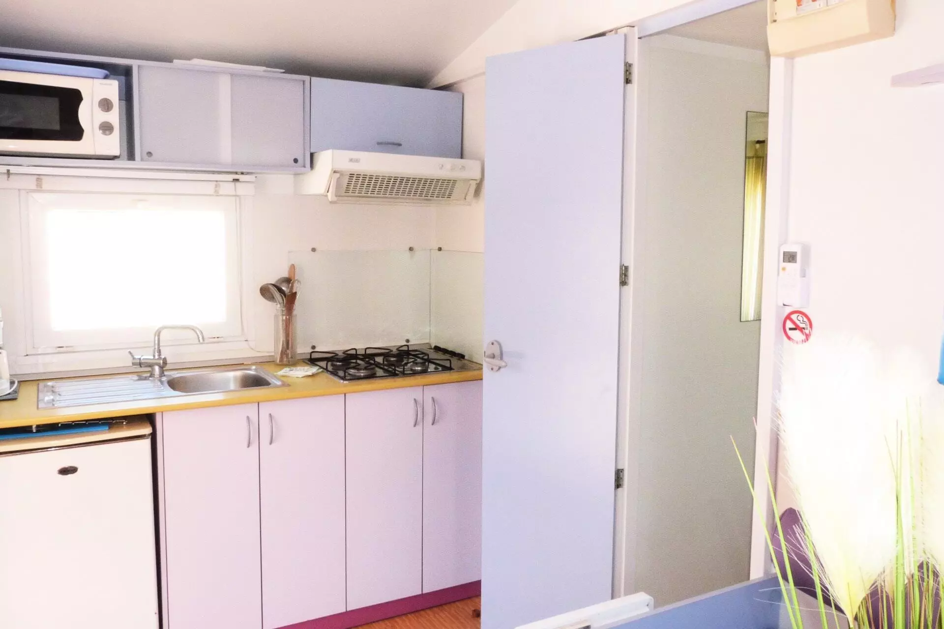 - Réfrigérateur, micro-ondes, cafetière à capsules, plaque de cuisson