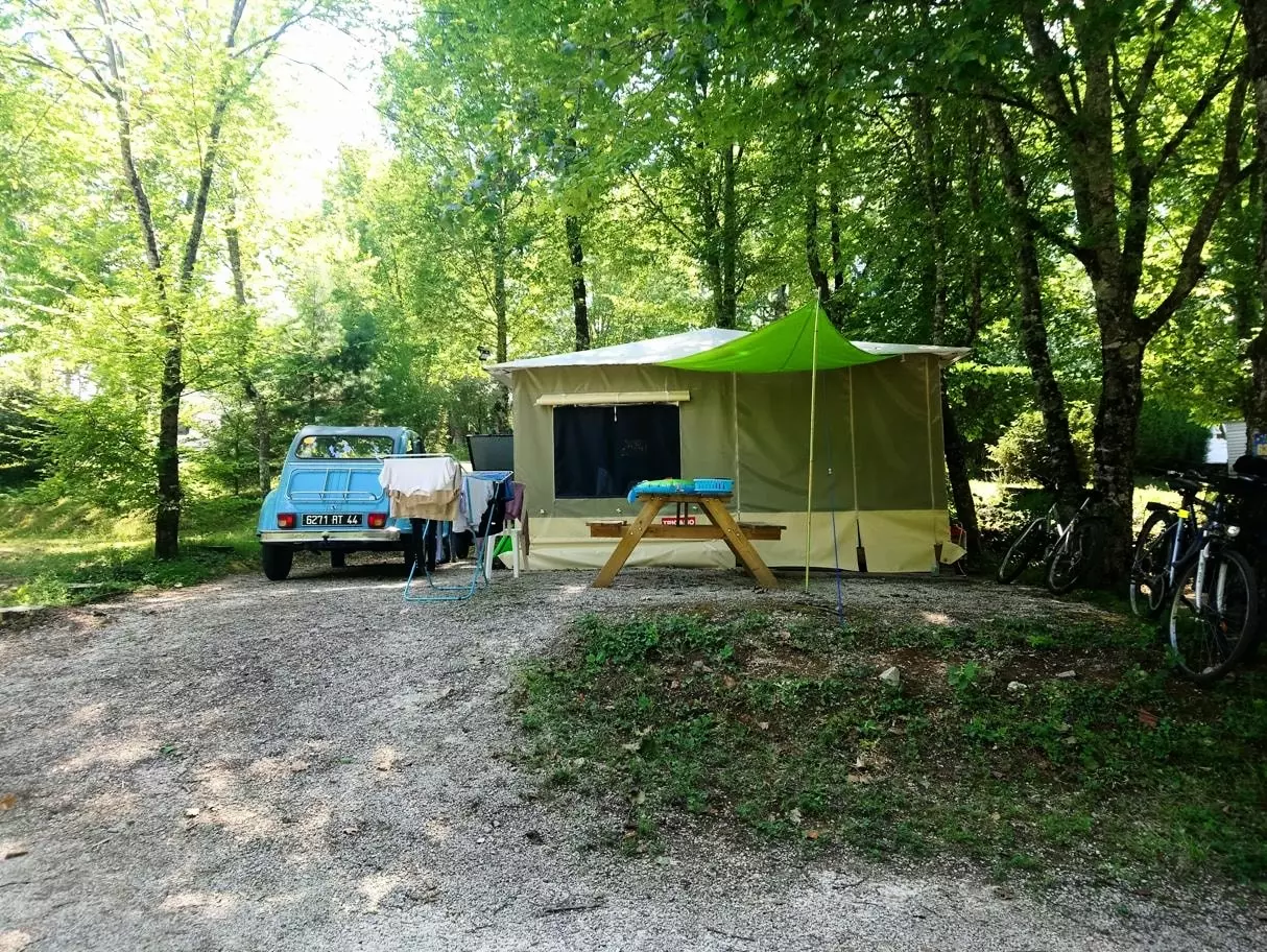 Grande tente équipée 20m² avec terrasse couverte de 12m², séjour/cuisine ouvrant sur l'extérieur.