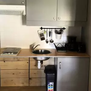 - Réfrigérateur, micro-ondes, cafetière dosettes-capsules, plaque de cuisson, grille-pain, vaisselle et ustensiles