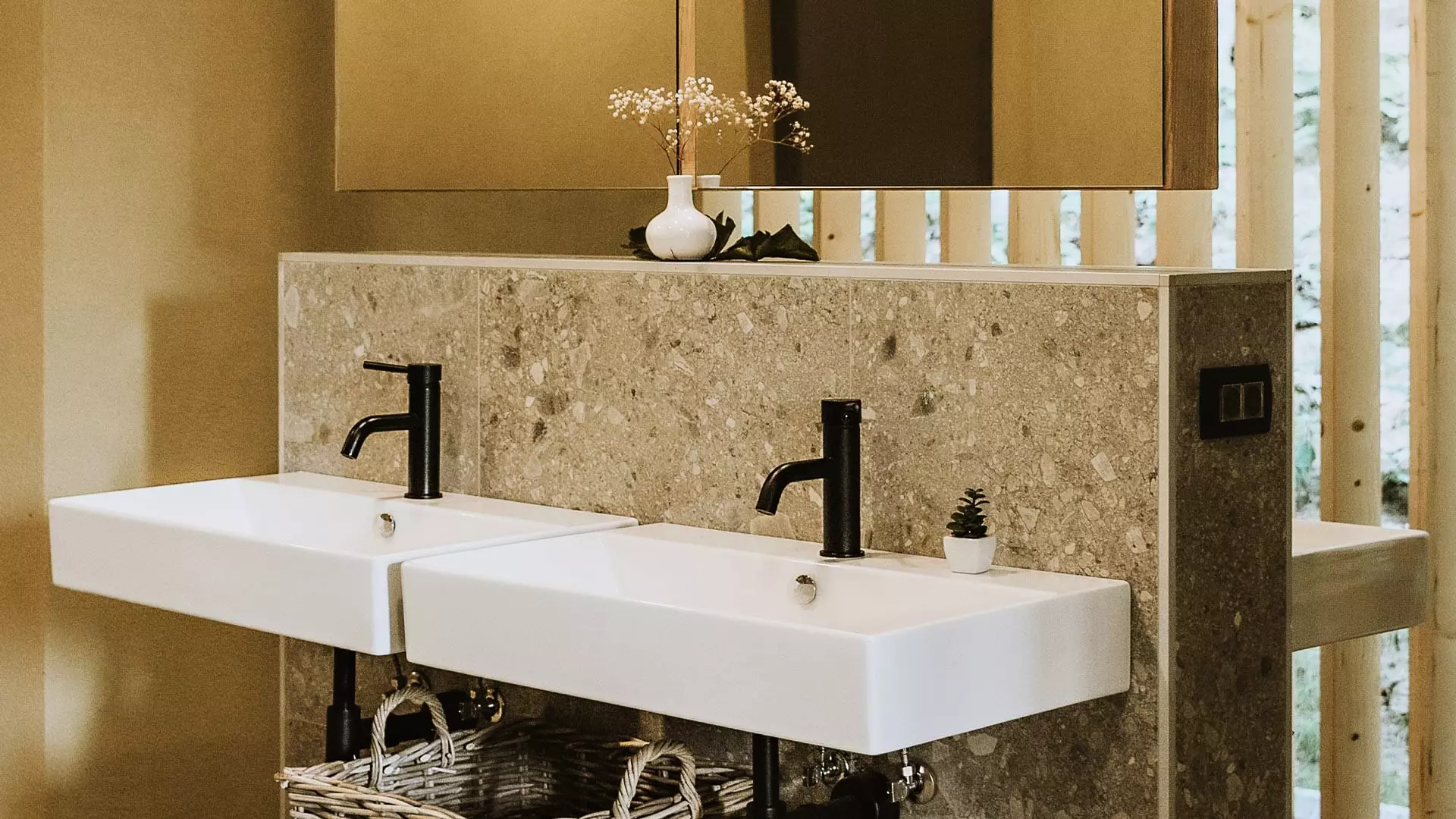 A noter : Les cabines de douche, les zones de lavage et les coins salon confortables se trouvent dans le bâtiment sanitaire situé à quelques mètres de la cabane.