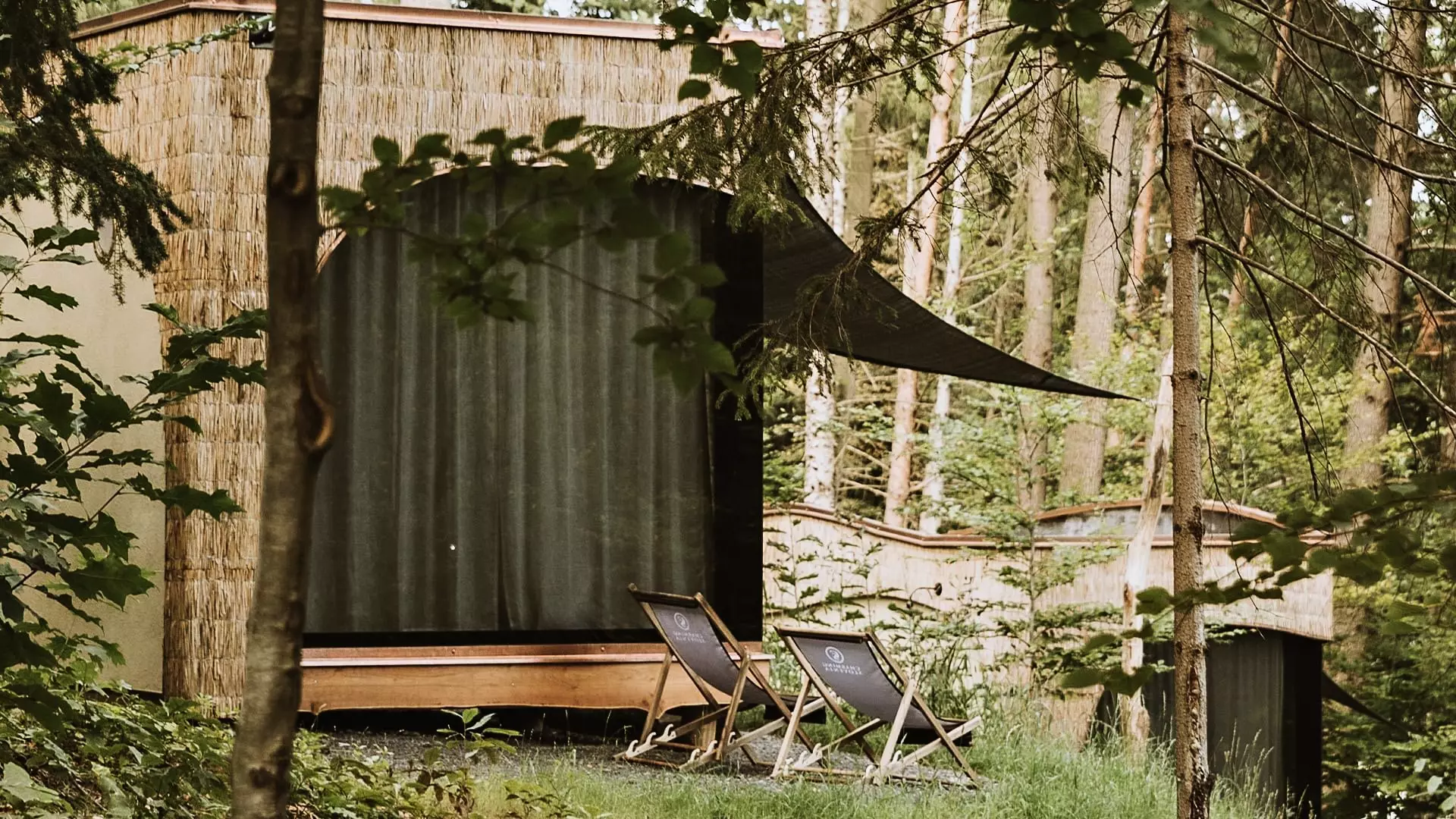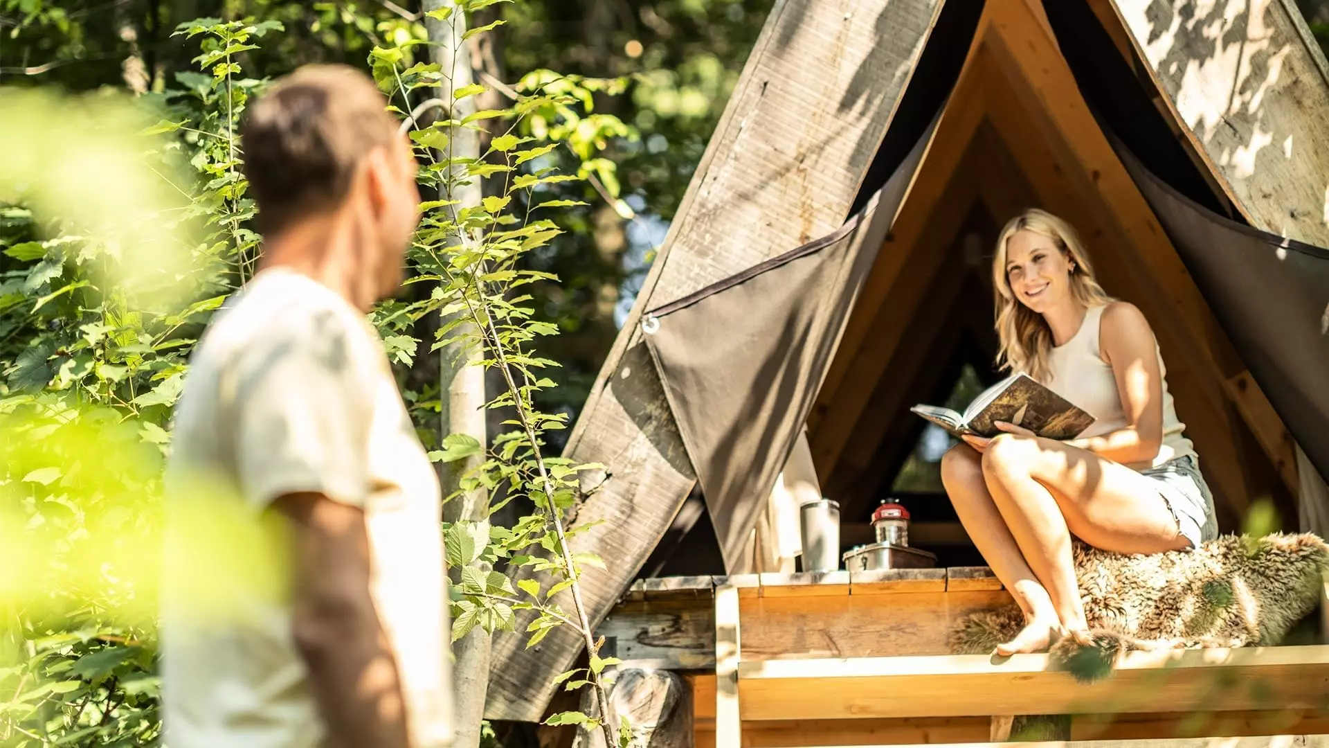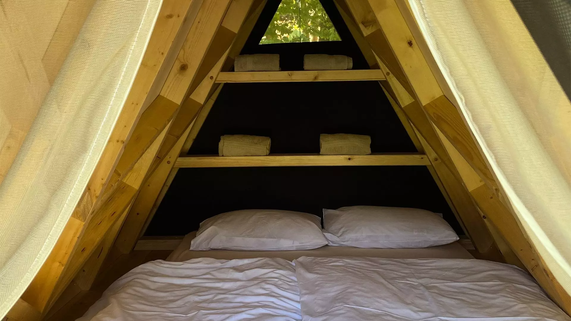 Une tente en bois résistante aux intempéries est installée sur chaque emplacement, équipée d'un lit double (1,40 m).