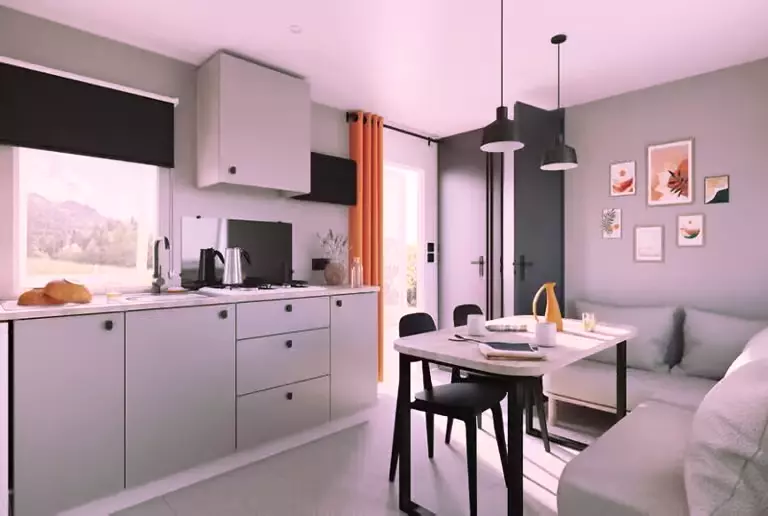 - Séjour / coin cuisine : Banquette, Bouilloire, Cafetière électrique (filtre), Cuisine équipée, Evier, Micro-ondes, Plaques de cuisson 4 feux électriques ou gaz, Réfrigérateur avec freezer, Table et chaises