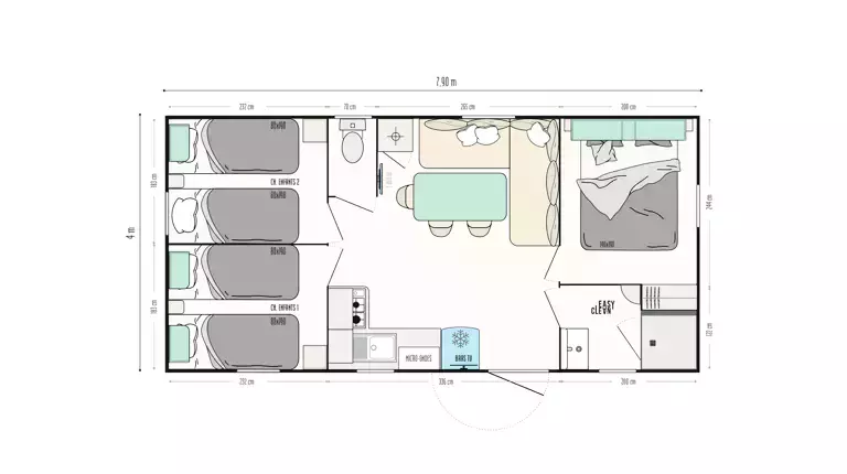 - Séjour (partie couchage) : Banquette-lit convertible (le couchage ne convient pas à des personnes de plus de 15 ans)