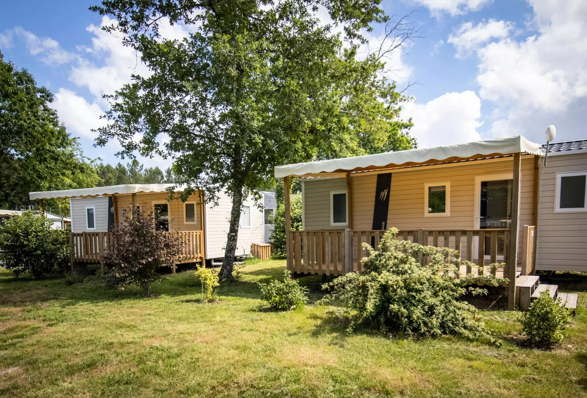 Mobil-home 3 pièces 4 personnes de 25m² composé d'un séjour, d'une kitchenette équipée, d'un coin repas, d'une chambre avec un lit double, d'une seconde chambre avec deux lits simples, d'une salle de douche avec WC séparés et d'une terrasse couverte.