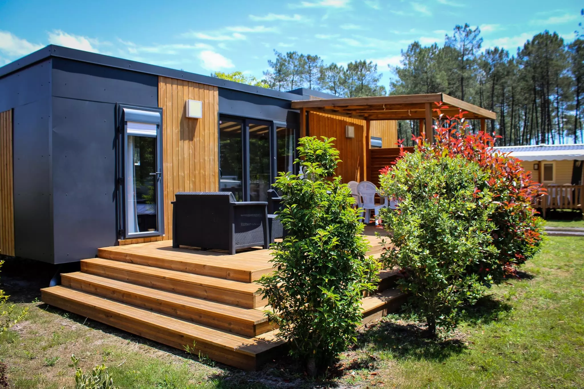 Table sous l'habitat, terrasse avec fauteuils, sanitaires à proximité.