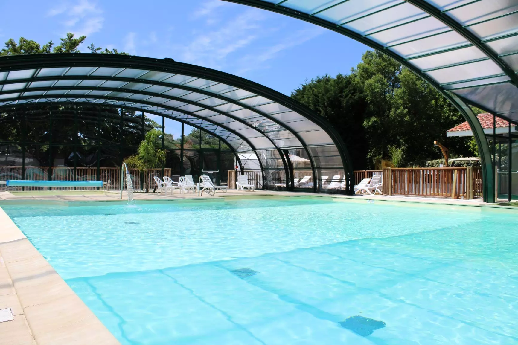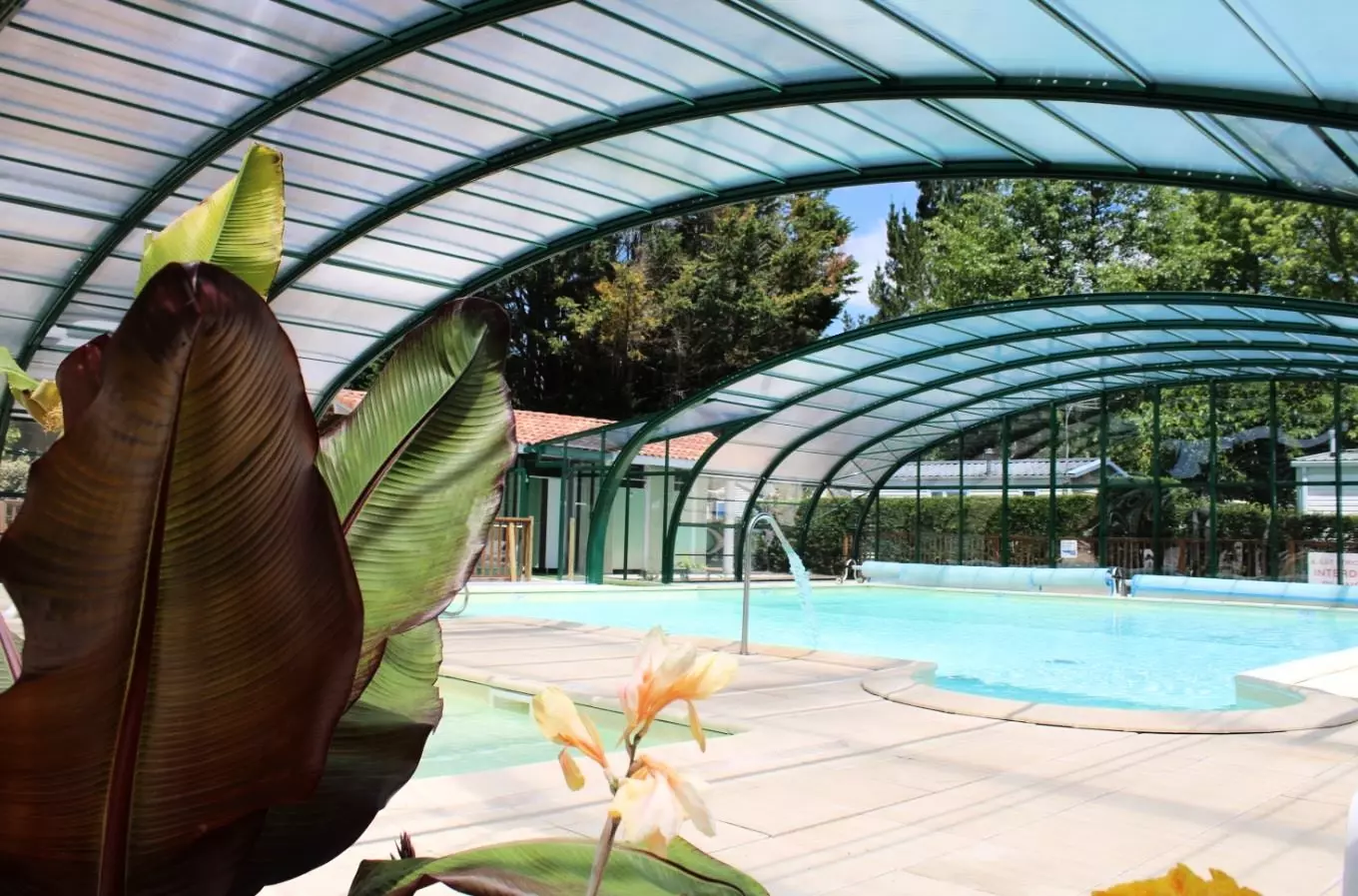 Piscine couverte et chauffée avec bain bouillonnant et pataugeoire, et piscine d'exterieur chauffée.