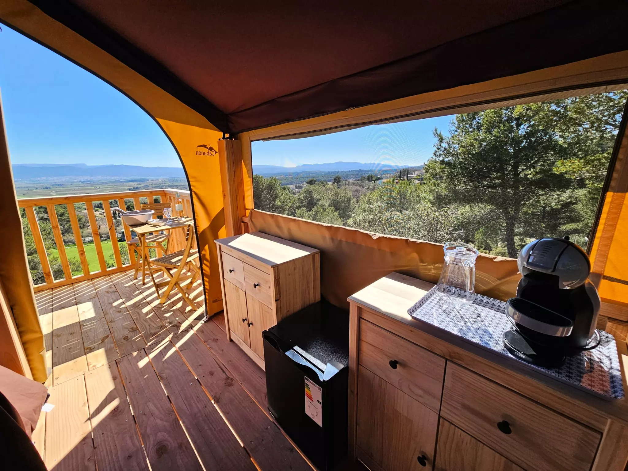 Perchée à 2 mètres de hauteur au point culminant de notre camping, cette cabane en bois avec sa toile de tente vous offre une expérience unique en pleine nature. Depuis votre terrasse ou votre lit, profitez d'une vue imprenable sur les massifs environnants : la Sainte-Victoire, le Garlaban, la chaîne de l'étoile et le mont Aurélien.