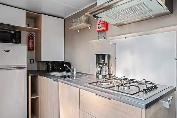 - Séjour / coin cuisine : Bouilloire, Cafetière électrique (filtre), Cuisine équipée, Evier, Micro-ondes, Plaque de cuisson 4 feux gaz, Réfrigérateur avec freezer, Table et chaises, Télévision