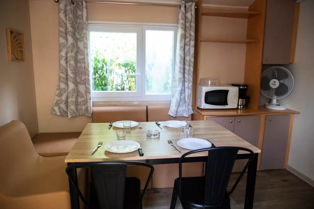 Coin séjour cuisine comprenant : 1 table + 2 chaises+ banquette, 1 réfrigérateur 1 plaque de cuisson, 1 micro-onde, 1 cafetière électrique,1 évier eau chaude.