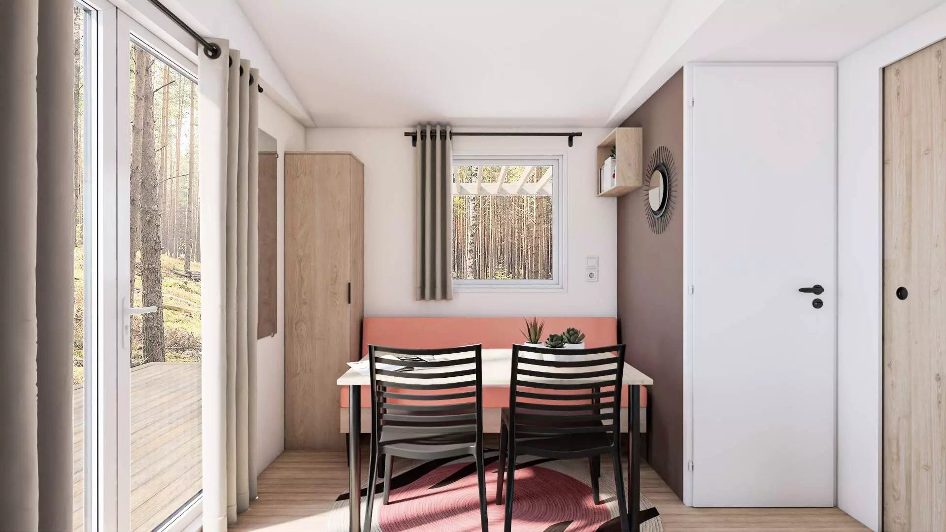 Coin salon séjour comprenant : une table ,des chaises,une banquette .