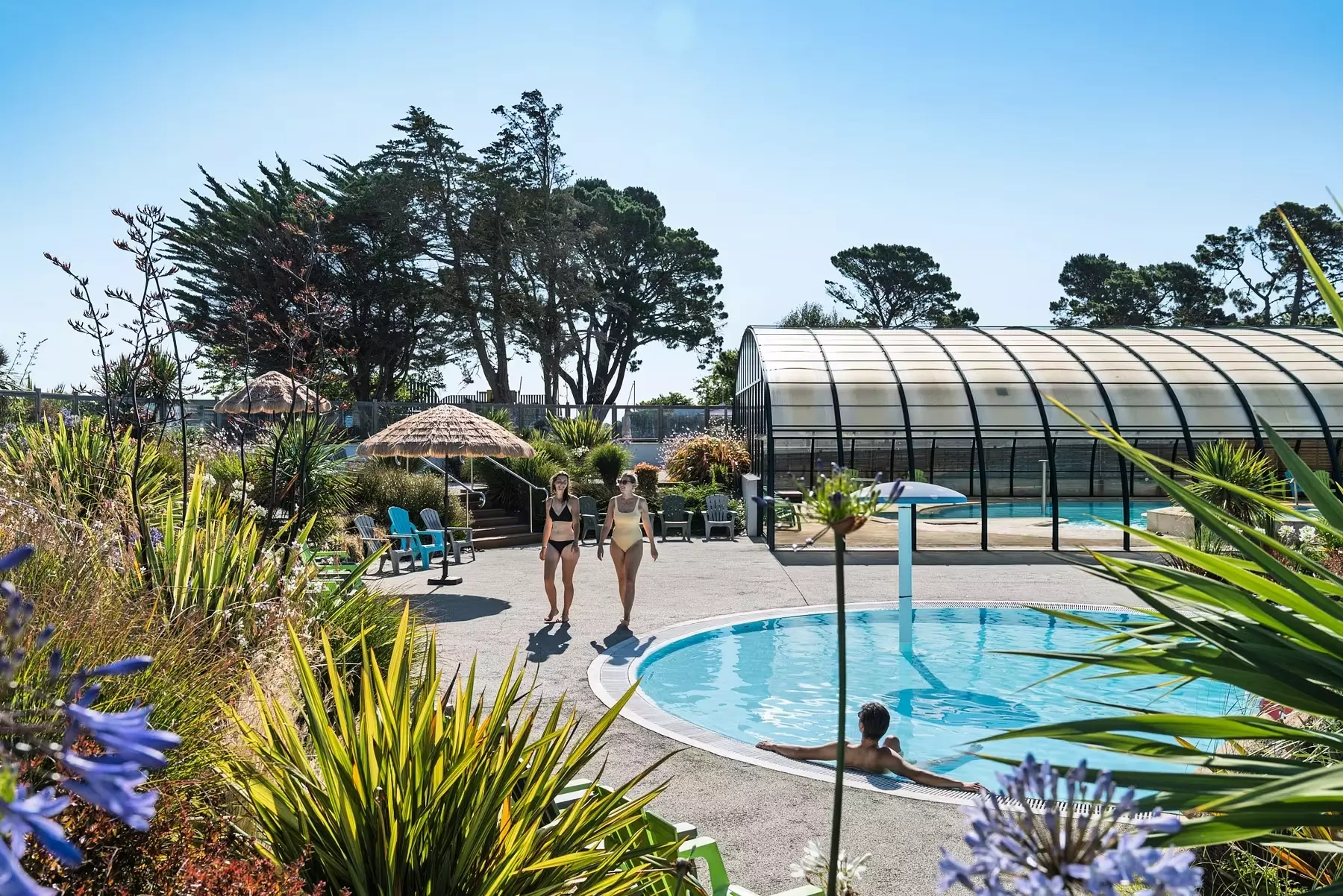 En plus de la plage, vous pourrez profiter sur place d'un parc aquatique de 490m² composé d'un espace couvert chauffé avec piscine, d'un espace extérieur avec piscine chauffée exclusivement en juillet-août, toboggans, jeux d'eau et pataugeoire.