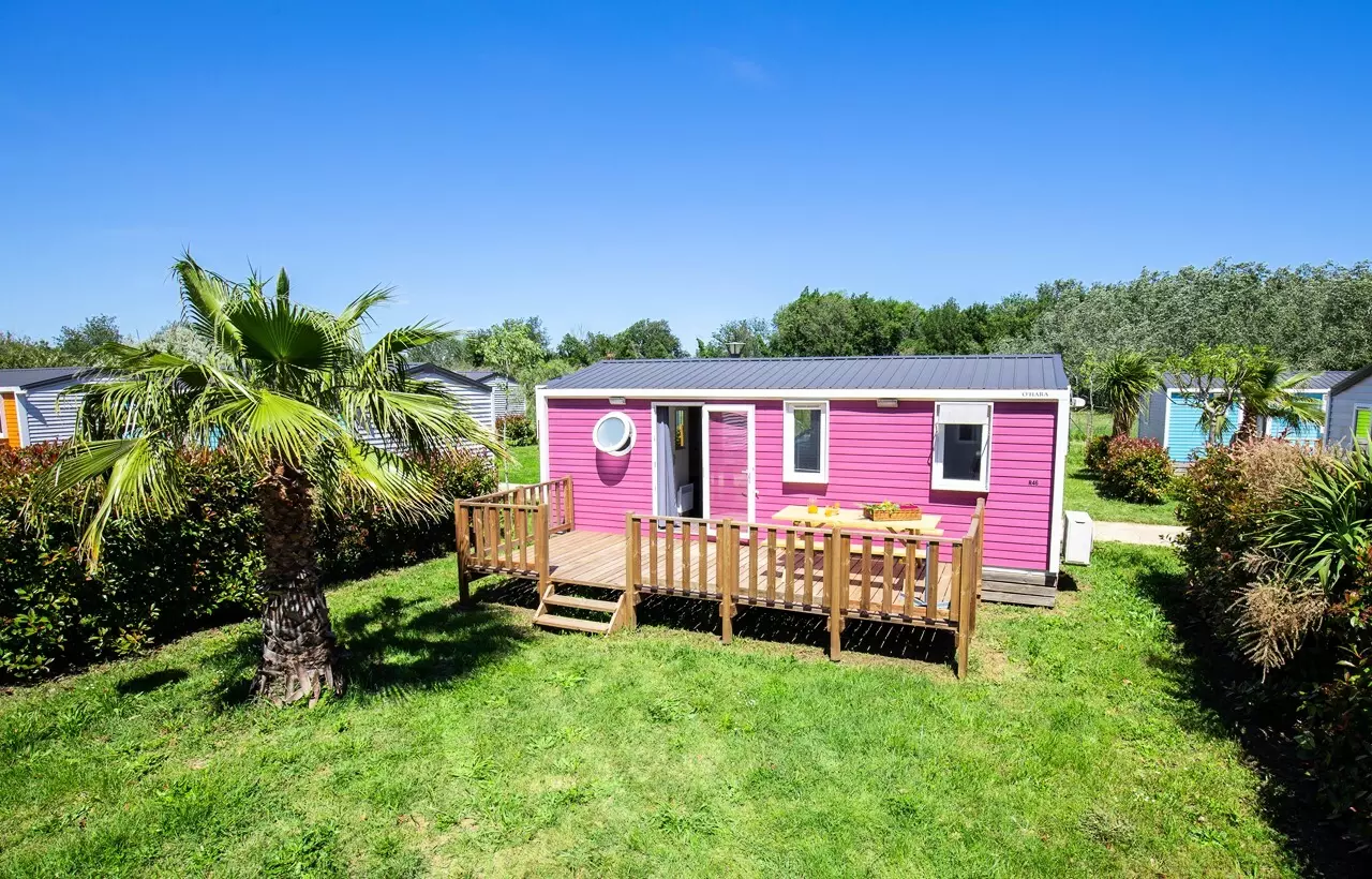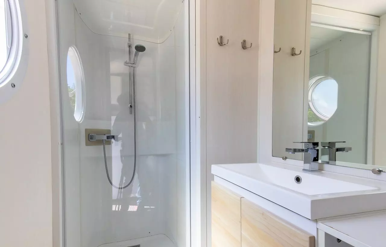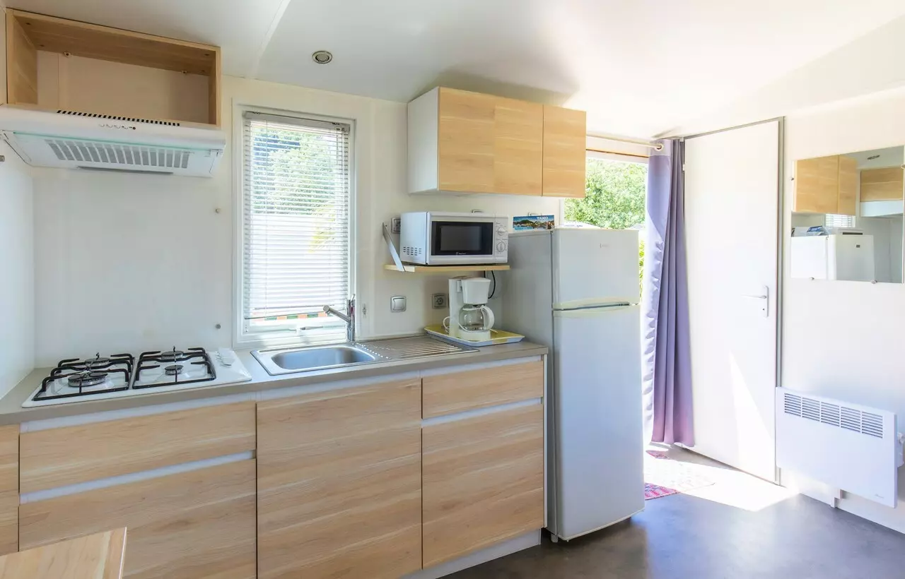 Le mobil home est équipé de la climatisation, d'une télévision, d'une connexion wifi pour 2 appareils, d'une plaque de cuisson, d'un réfrigérateur, d'un micro-ondes, d'une cafetière et d'un salon de jardin sur la terrasse.