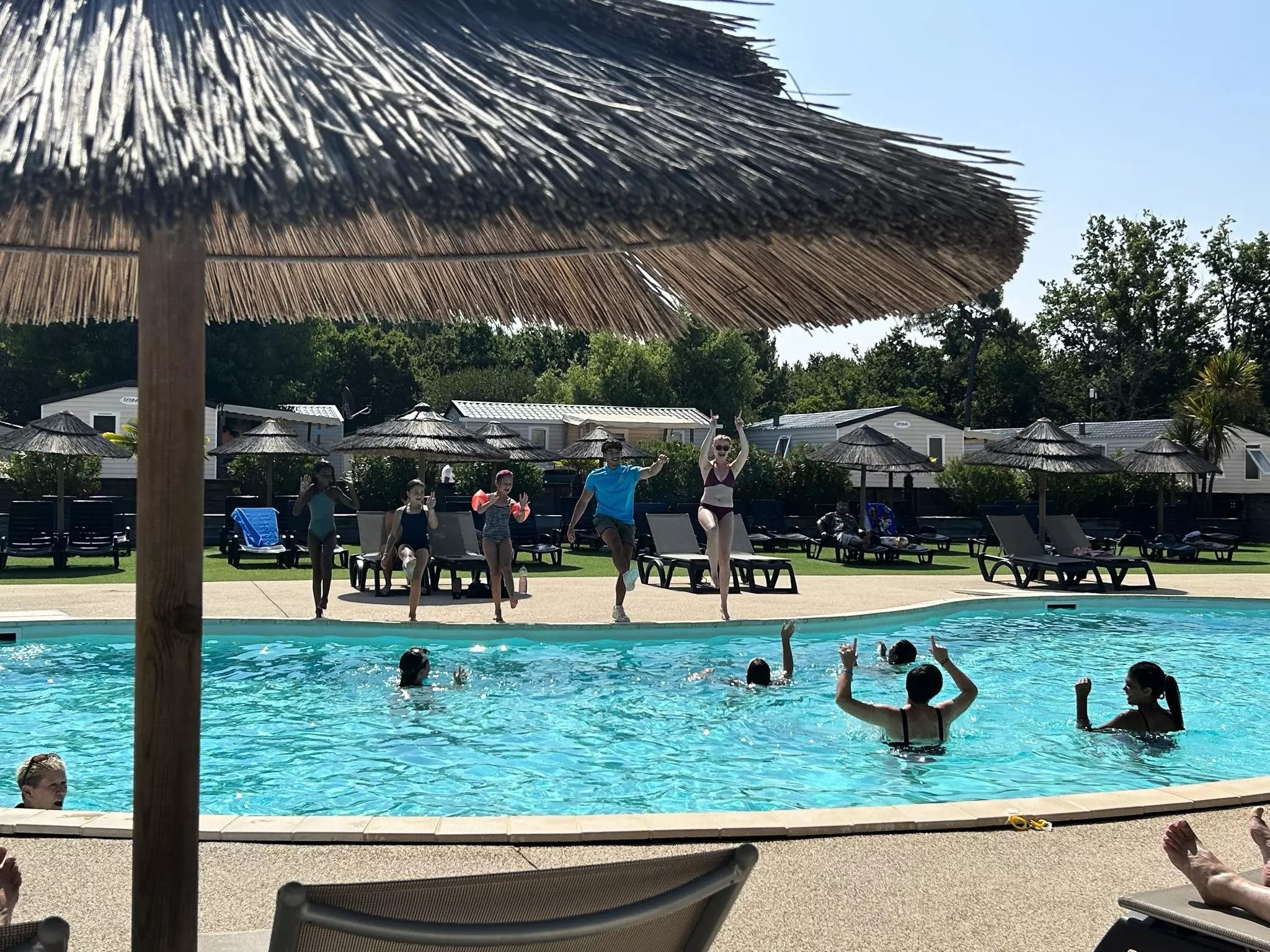 Tout autour de la piscine, vous pourrez lézarder au soleil ou à l'ombre des palmiers sur les chaises longues à disposition des vacanciers. Bonheur, joie et amusement sont au rendez-vous chaque jour !