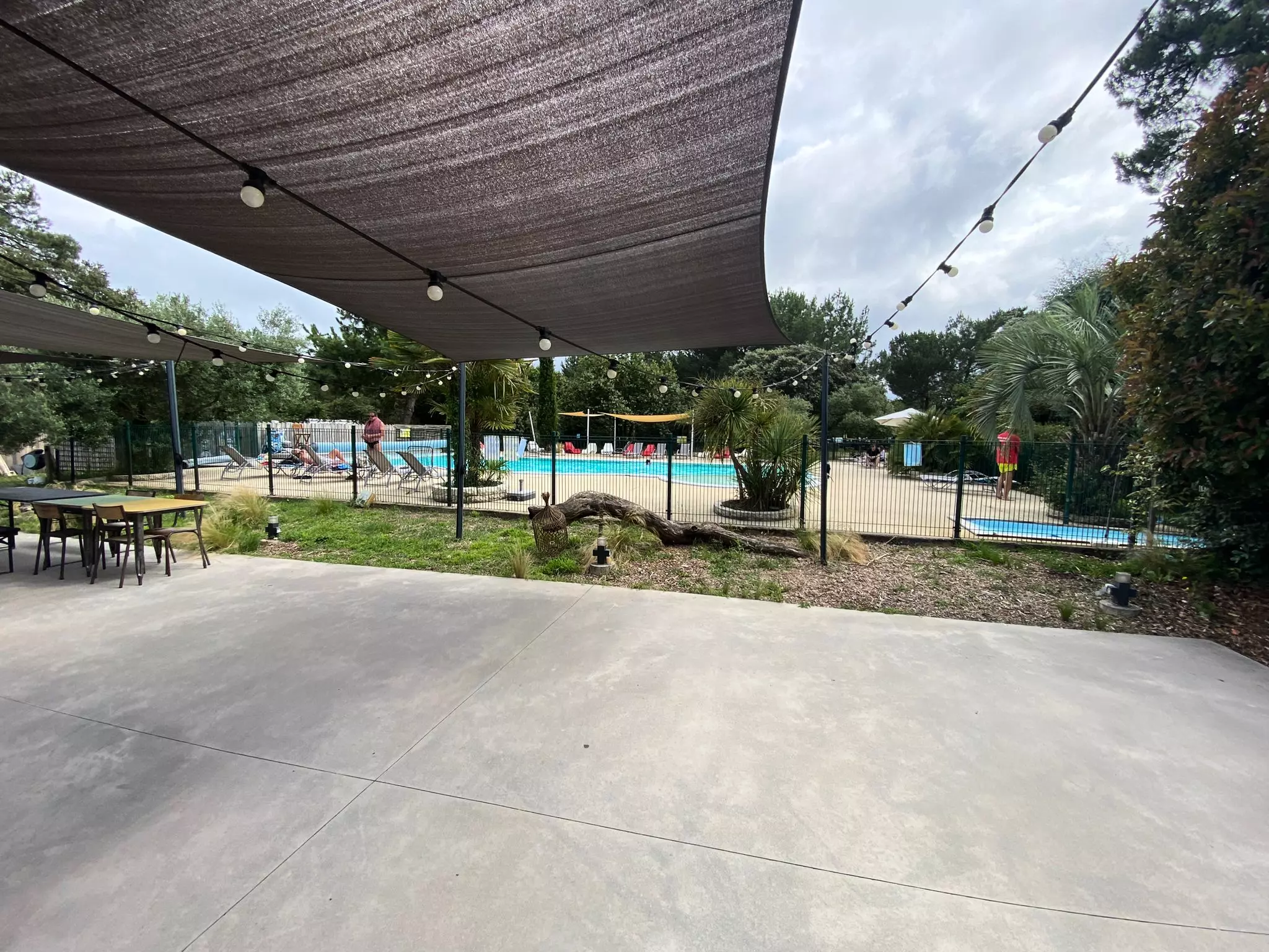 - Extérieur : terrasse couverte et table de pique-nique avec chaises