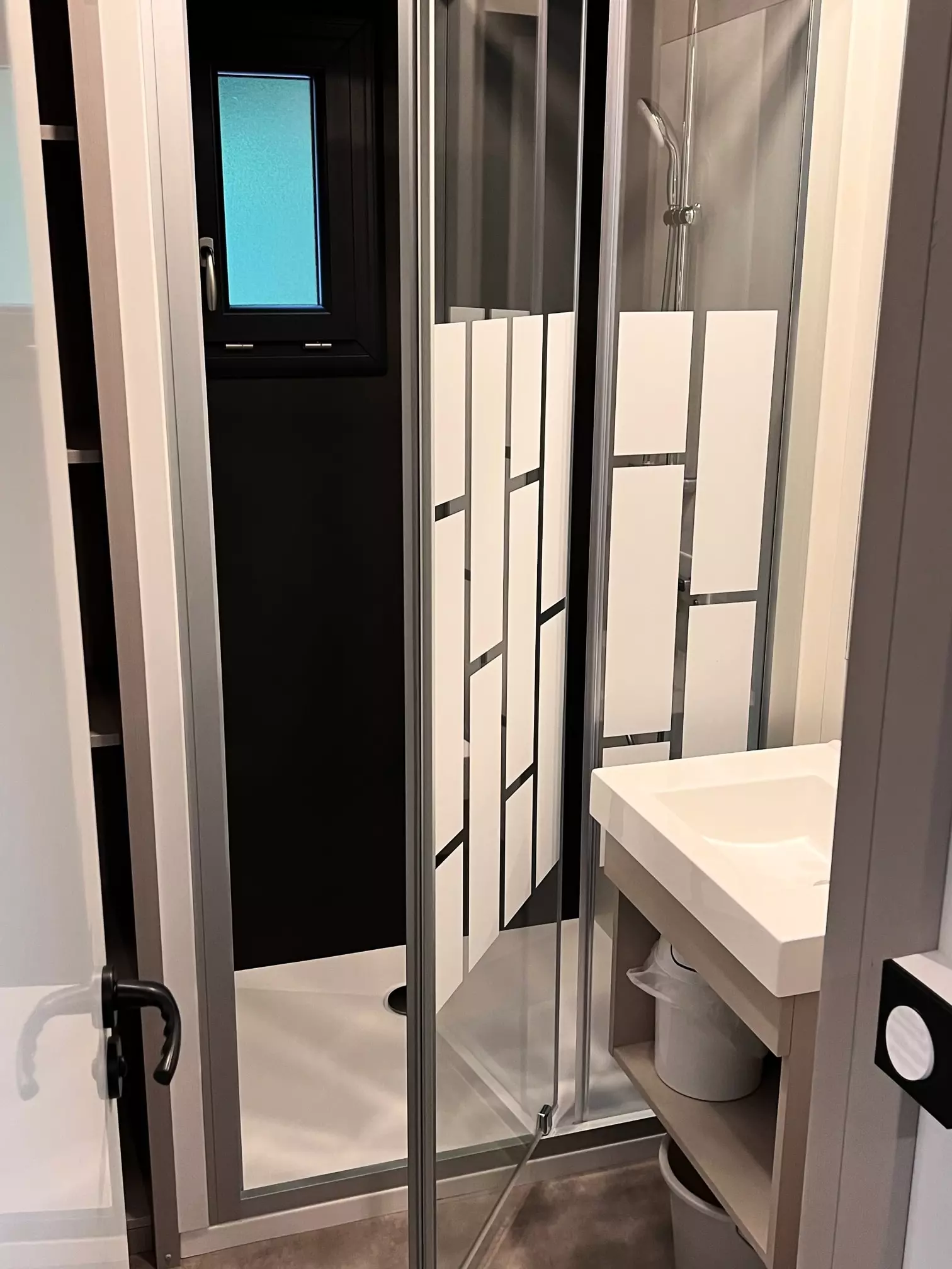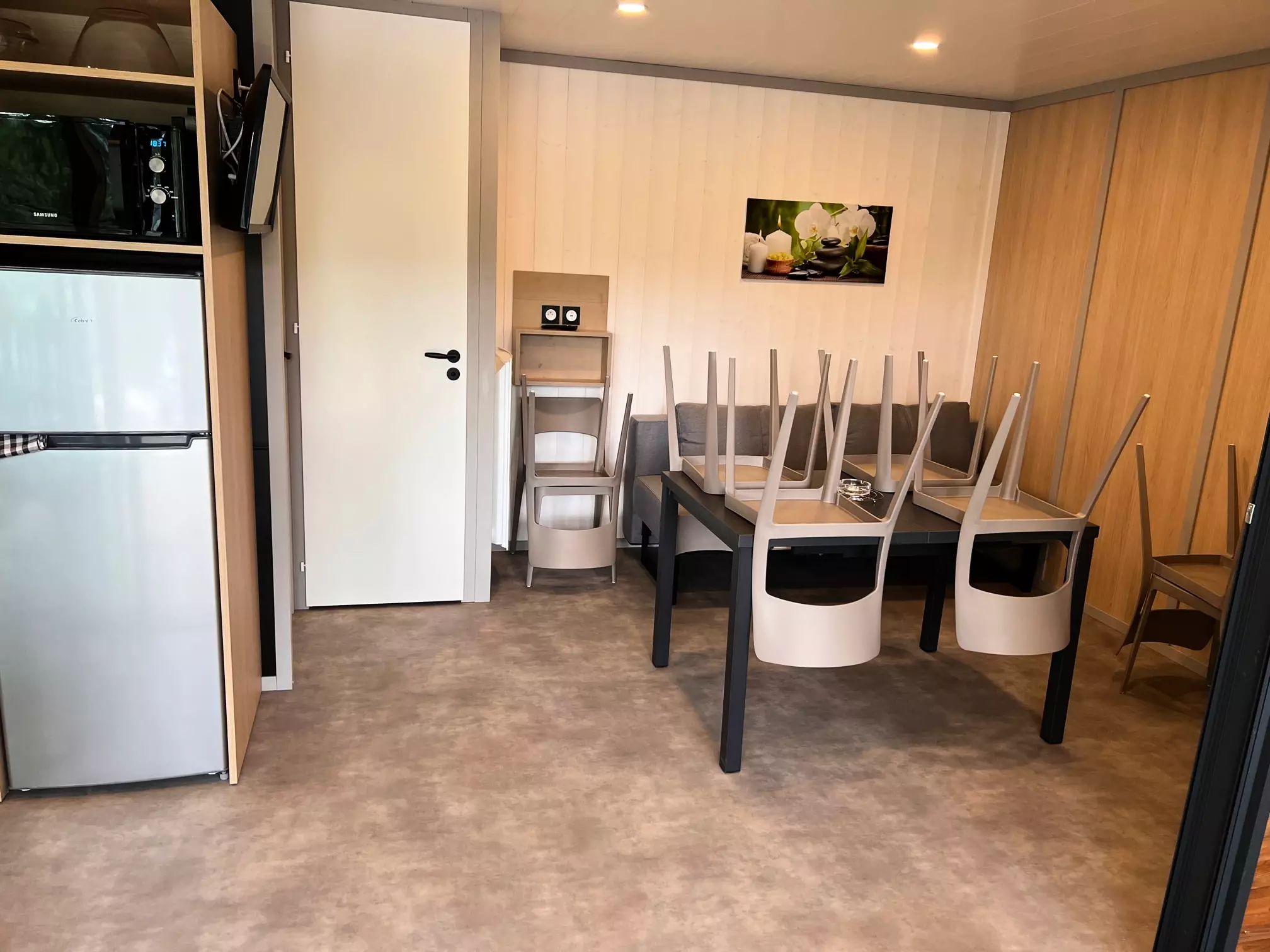 Mobil home I R M avec 1 chambre grand lit et deux avec 2 lits de 1 personne, salon convertible, salle de bain (douche, lavabo) WC, terrasse panoramique, wifi Gratuit, pré équipé antenne TV, réfrigérateur avec compartiment congélateur, micro-onde, plaque de cuisson gaz, cafetière, vaisselle. Salon de jardin.