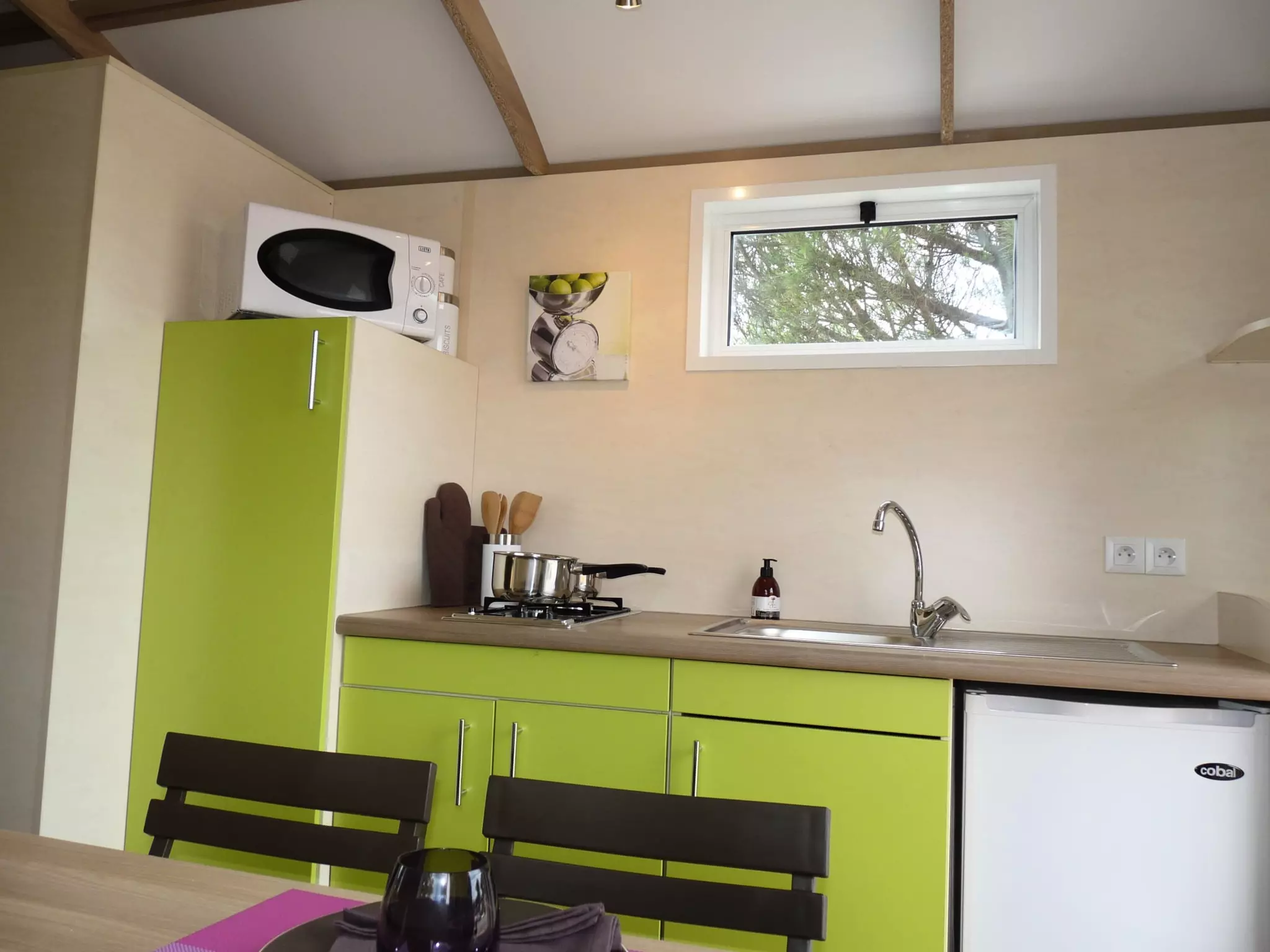 Le Mobil Home comprend un coin cuisine équipé avec réfrigérateur, plaque de cuisson gaz, micro-ondes, cafetière, ustensiles de cuisine et vaisselle adaptée au nombre de personnes dans le logement.