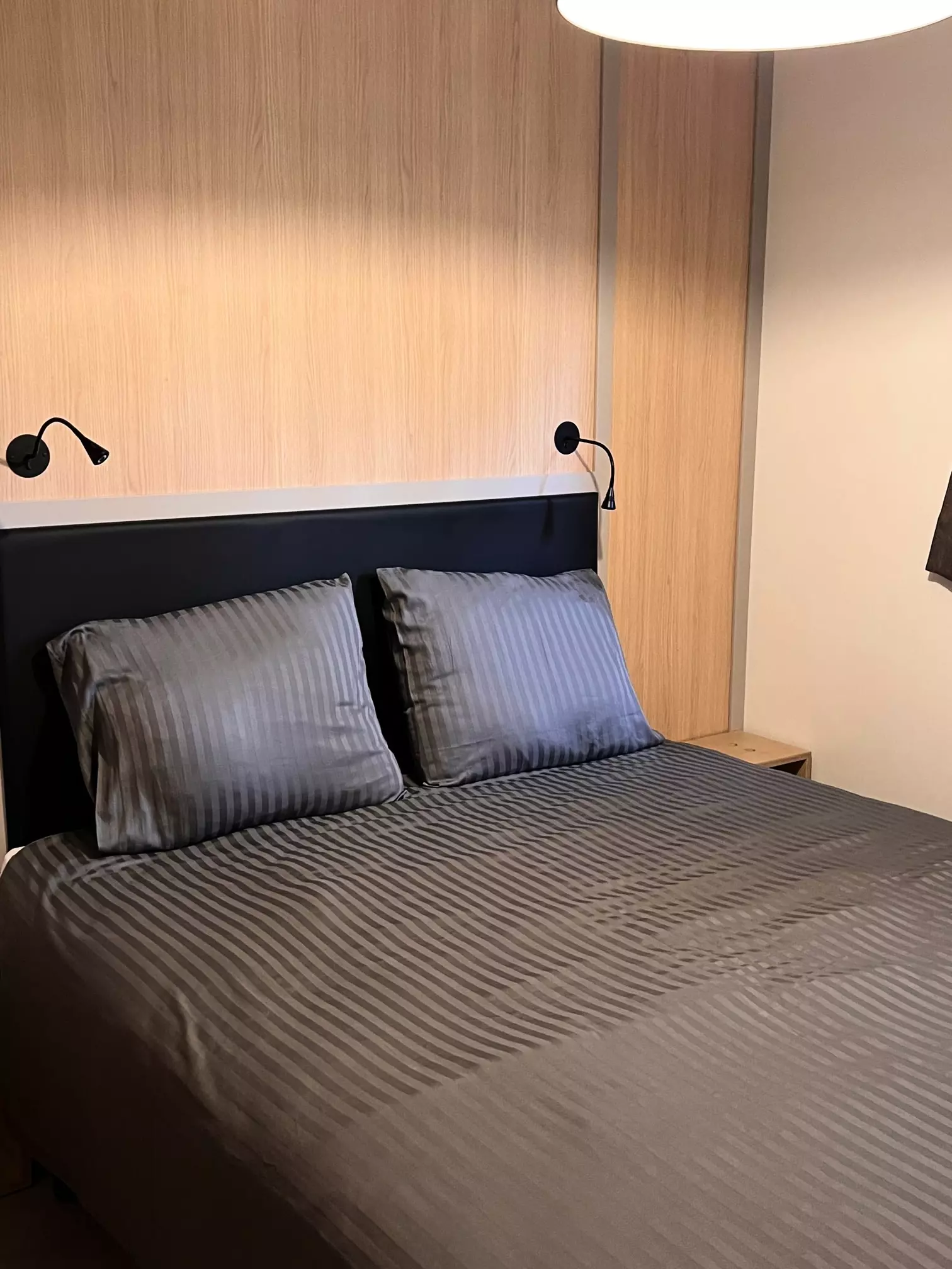 Studio entièrement rénové de 35 M² avec balcon, salle de bain séparée comprenant douche, lavabo, et WC, 1 grand lit, 1 clic-clac convertible, 1 salle à manger, kitchenette plaque de cuisson électrique, vaisselle, micro-onde, réfrigérateur.