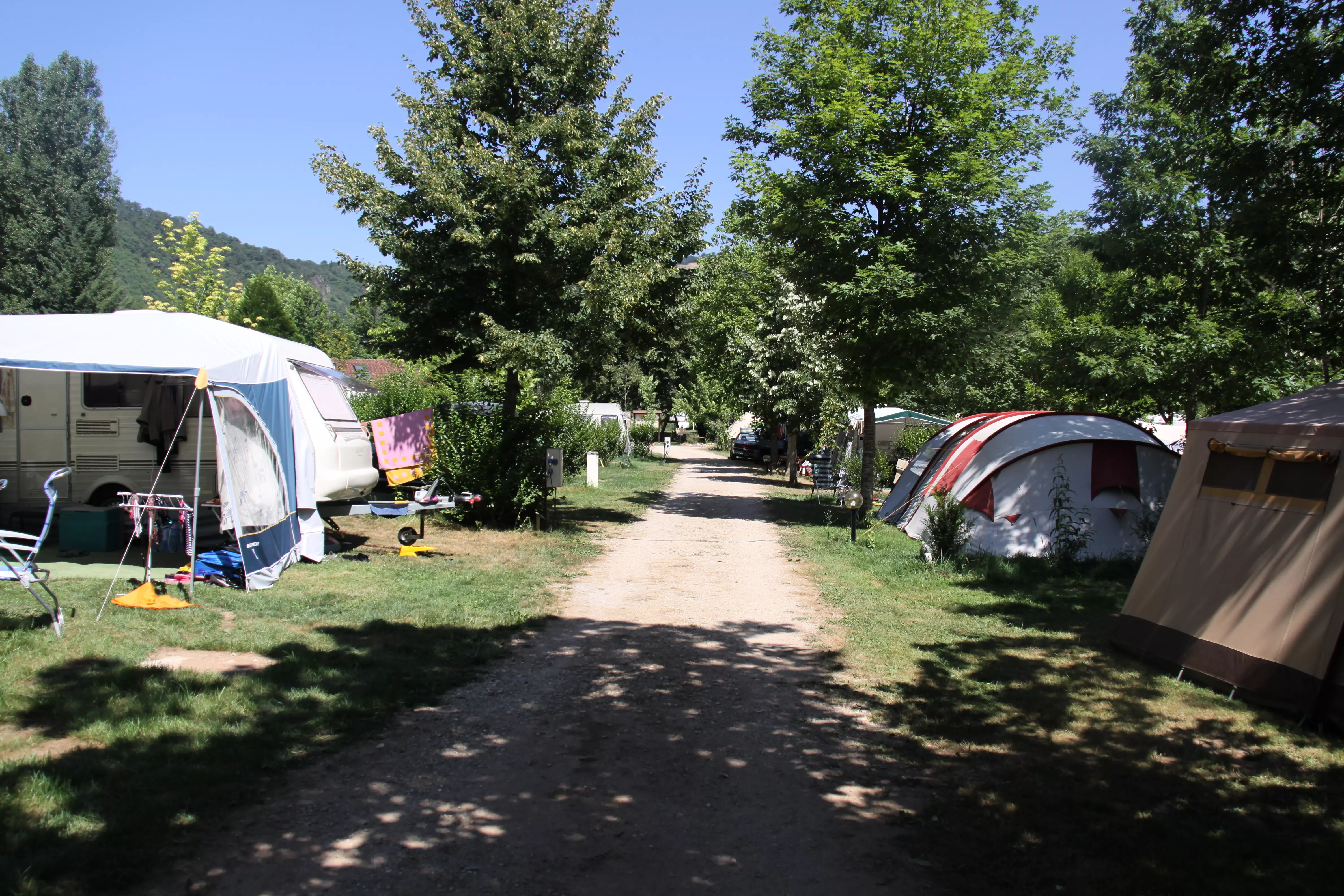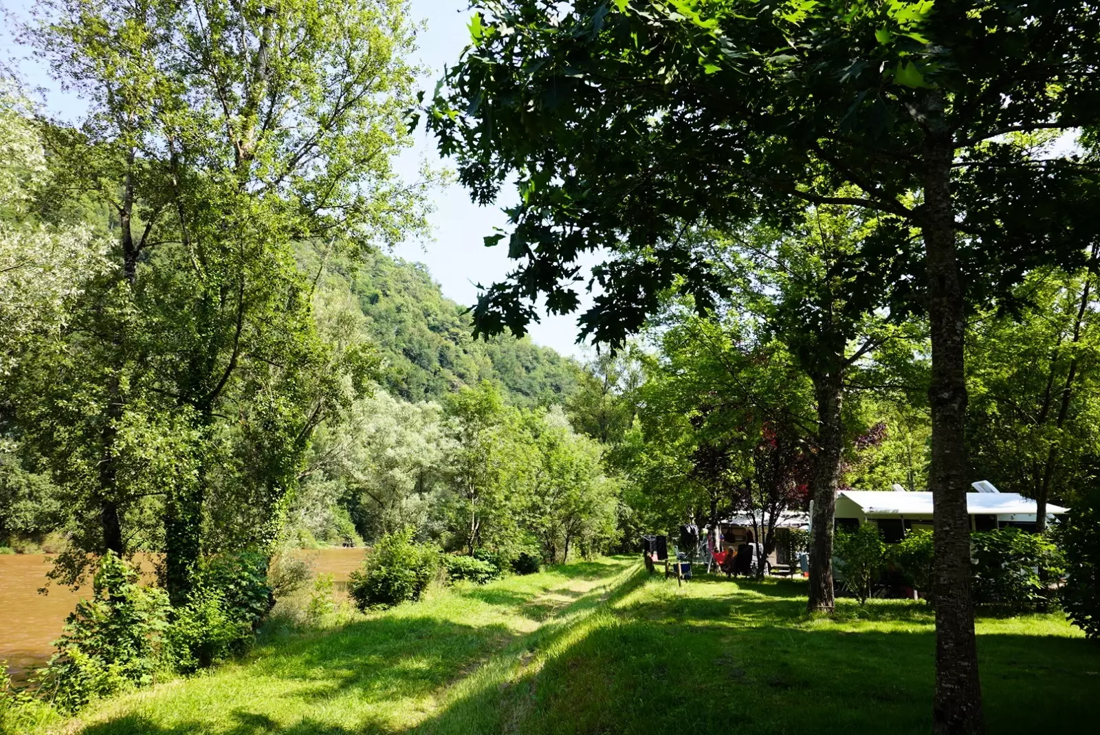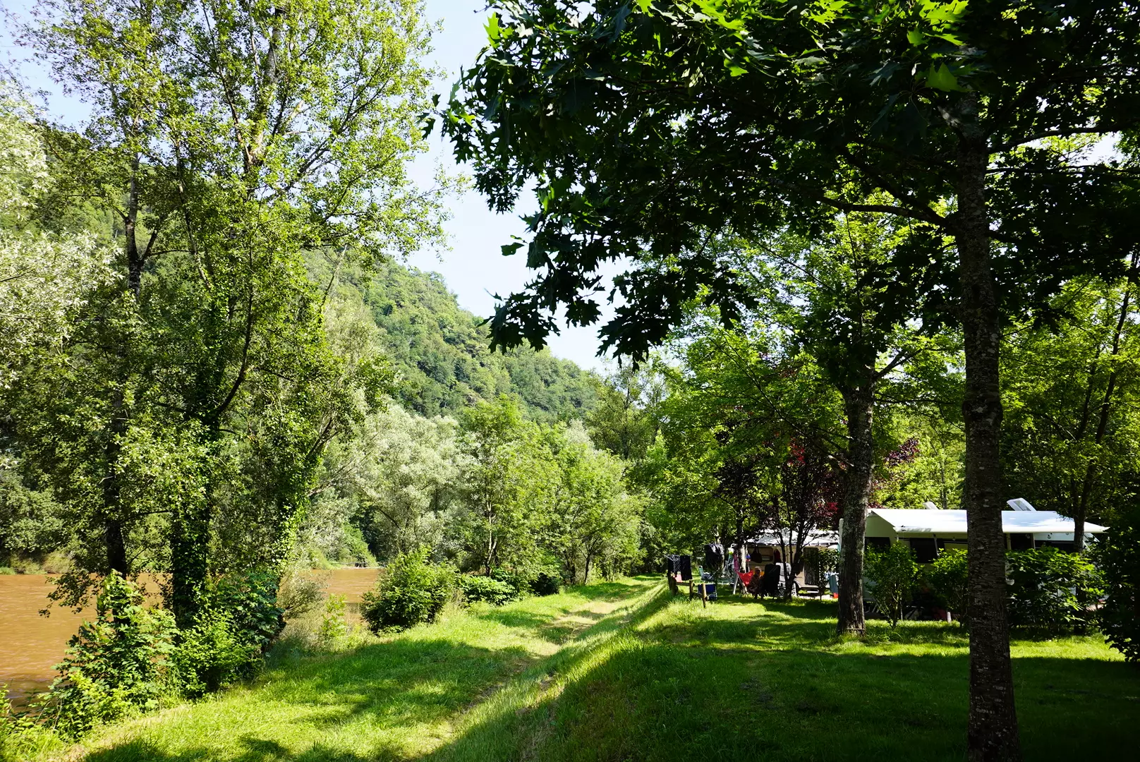Le terrain est situé dans une vallée pittoresque, avec accès direct à la rivière pour la baignade ou la contemplation. Les emplacements sont répartis sur des espaces herbeux bien entretenus, agrémentés d'arbres qui offrent ombre et fraîcheur. Le village de Saint-Parthem est à proximité, ce qui permet de concilier verdure et petites commodités.