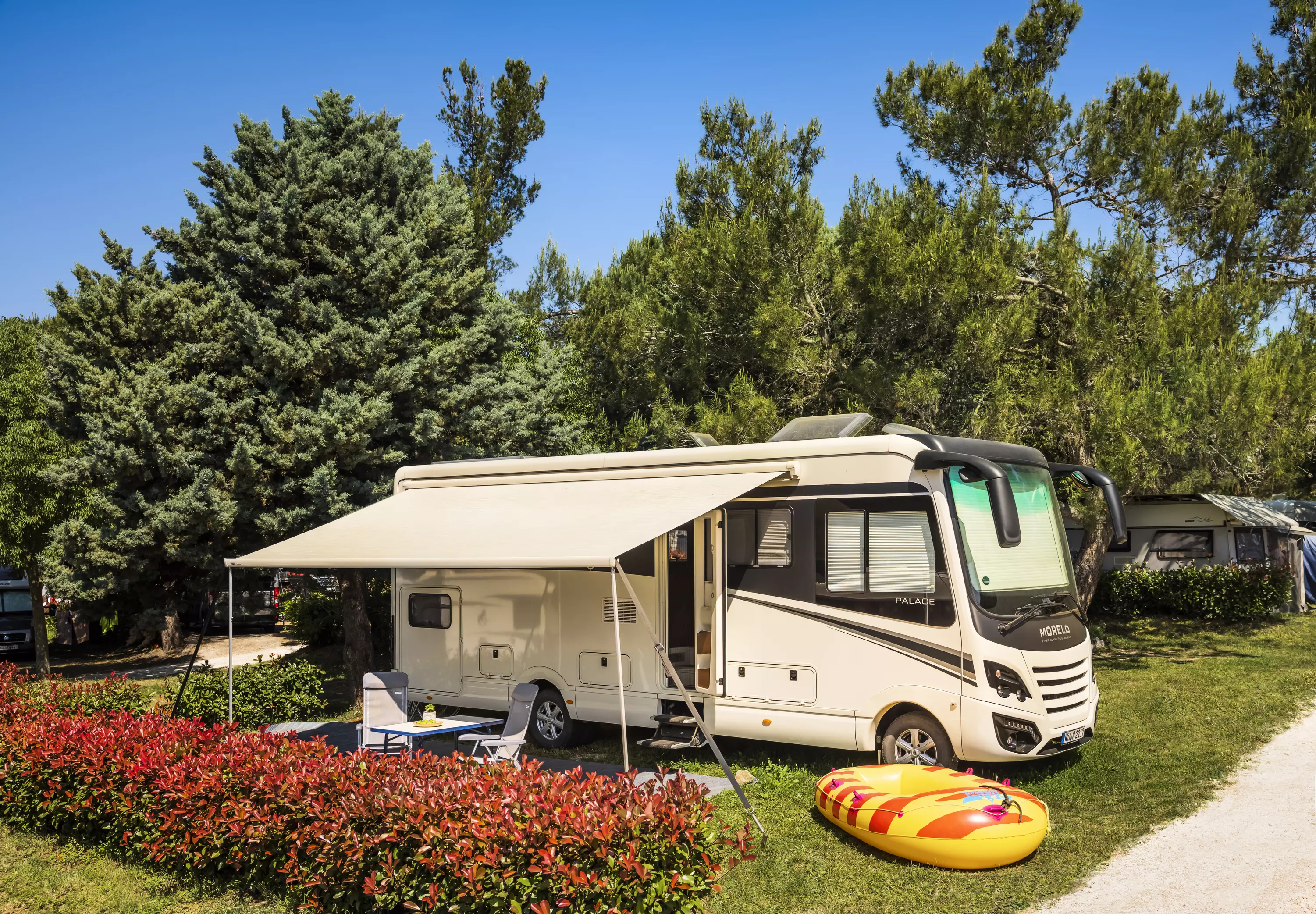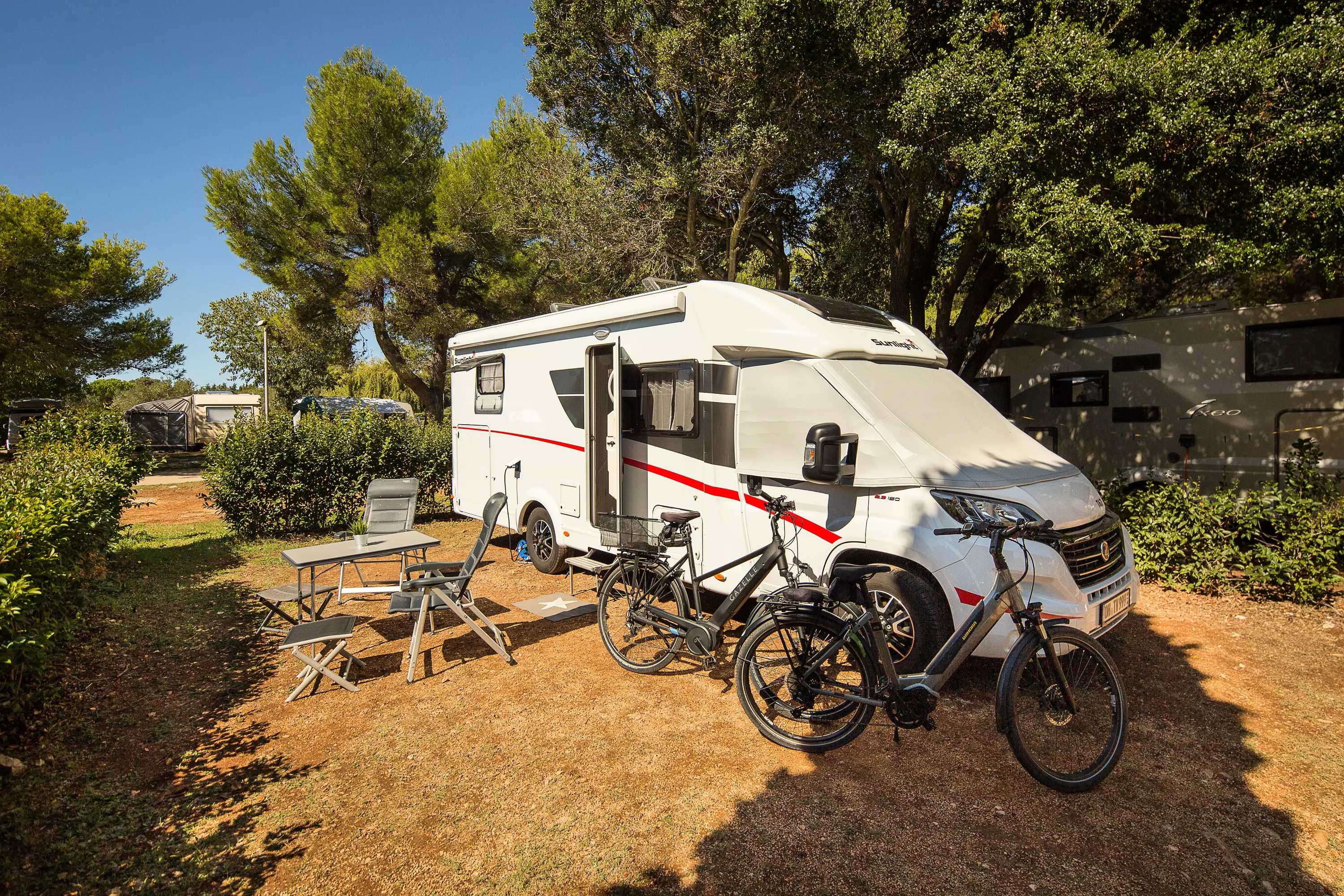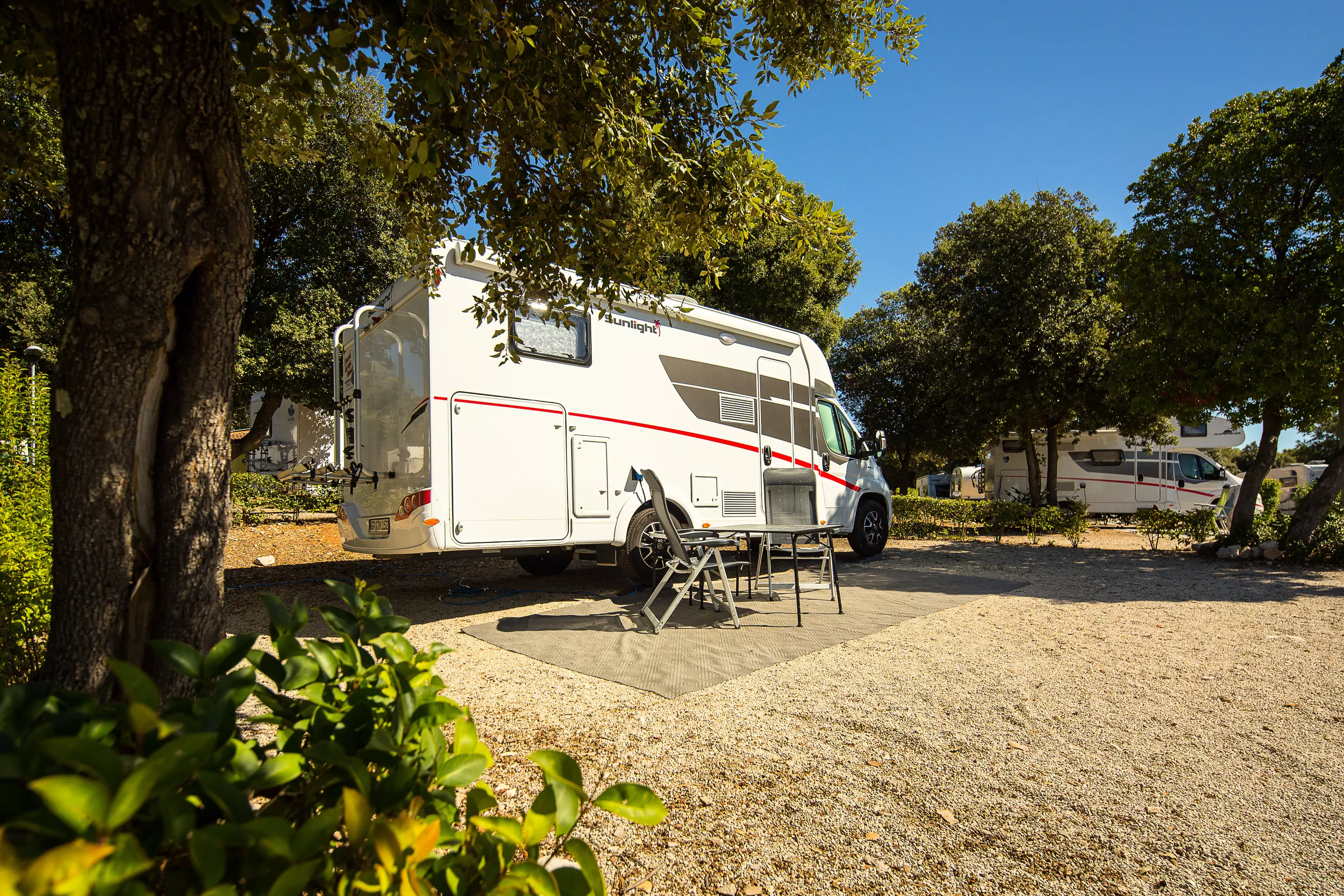 Les emplacements Premium, d'une surface de 90 à 120 m², se trouvent au cœur du camping, nichés à l'ombre partielle de la pinède.