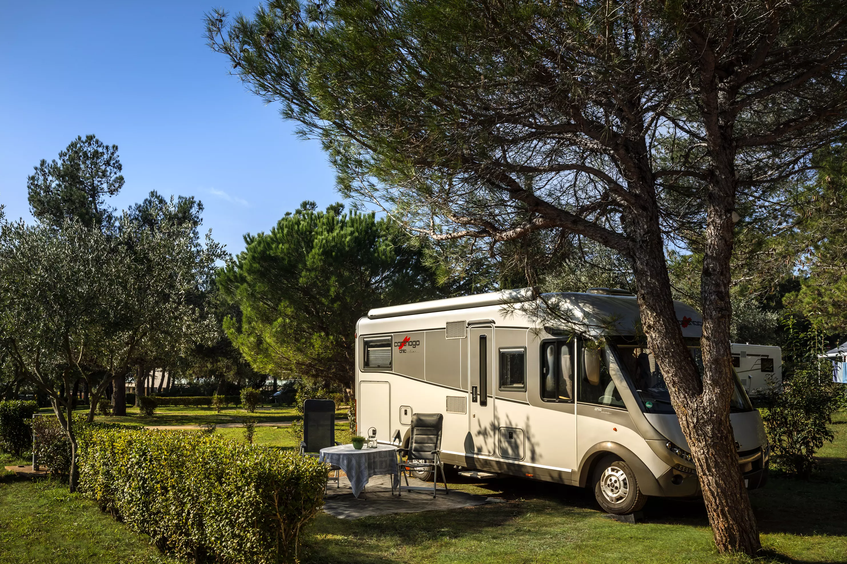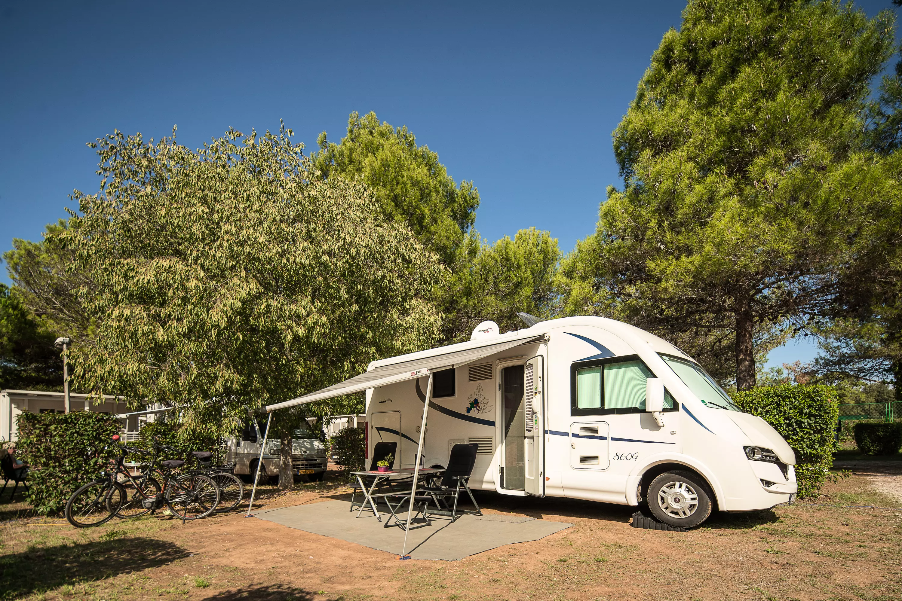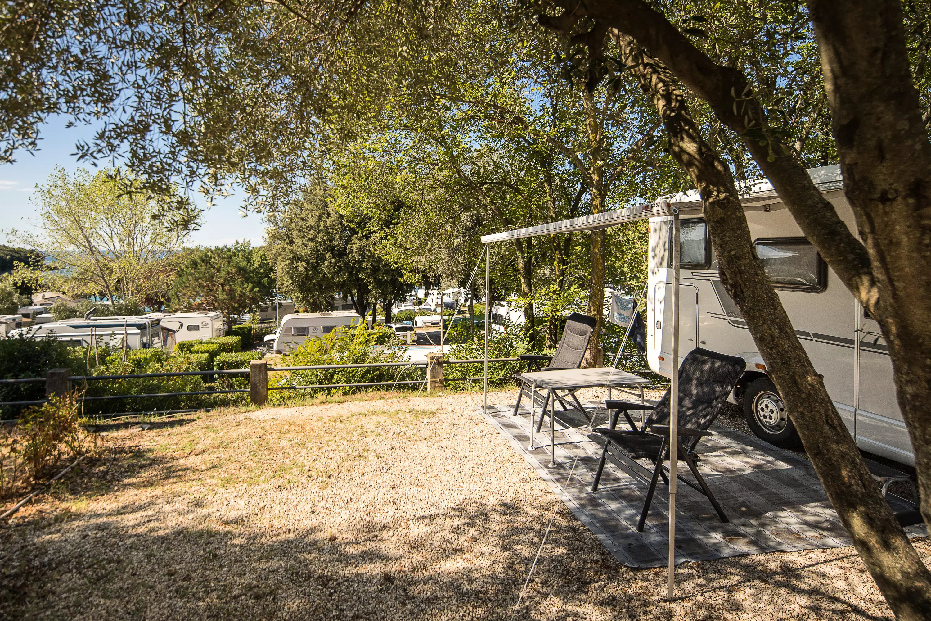 Les emplacements Premium, allant de 70 à 100 m², offrent un ombrage partiel et sont équipés de raccordements pour l'électricité, l'eau et l'évacuation des eaux usées.