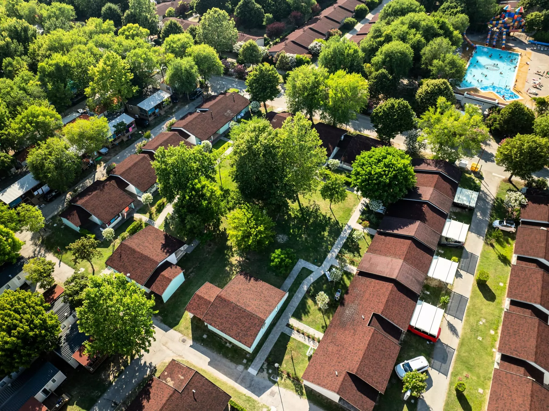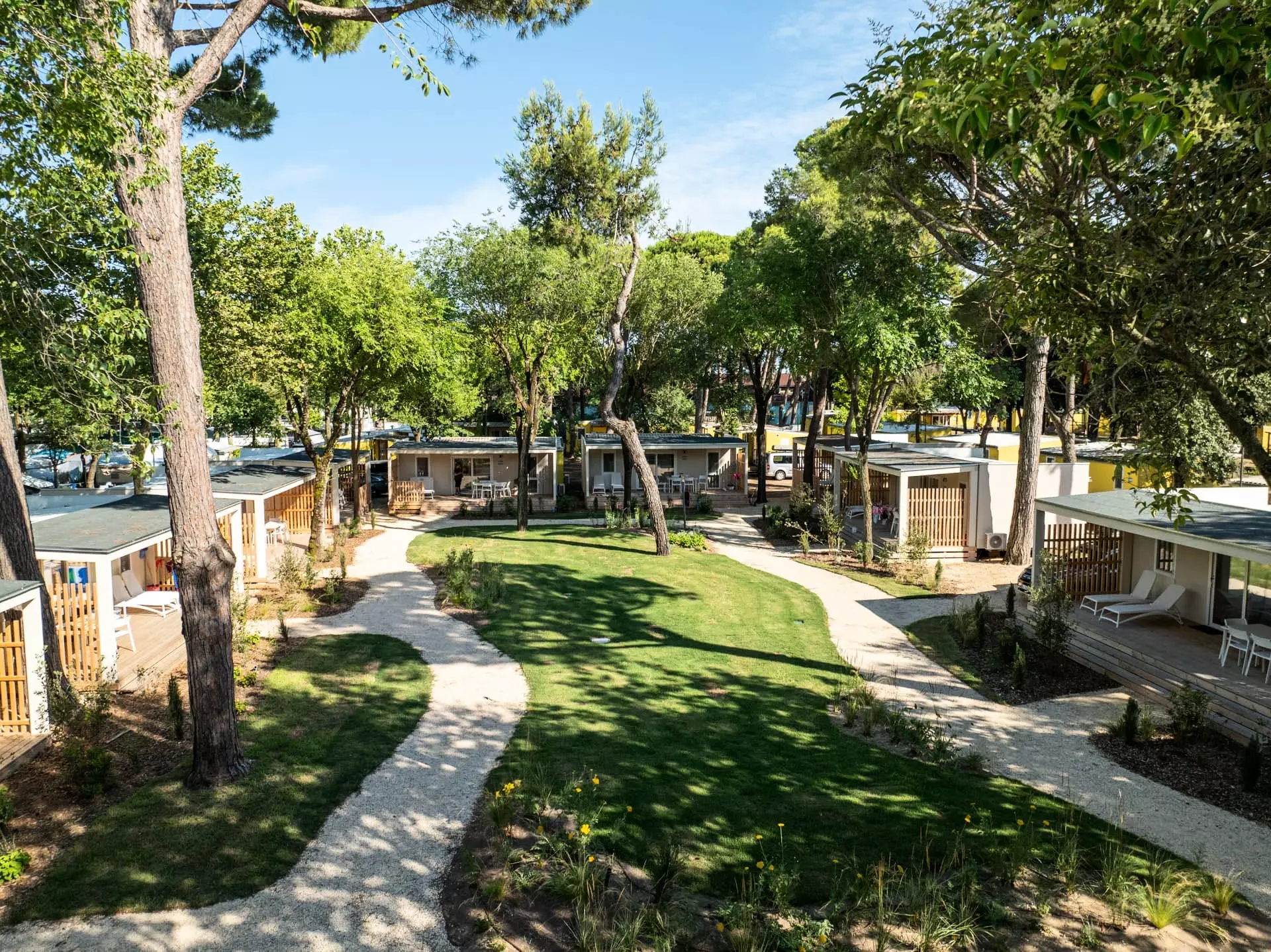 Petites maisons mitoyennes (pour 5 personnes) entourées de végétation, avec une grande zone verte commune au centre, situées dans les zones Belvedere et Penelope. Les animaux domestiques sont autorisés dans ce type d'hébergement moyennant un supplément.