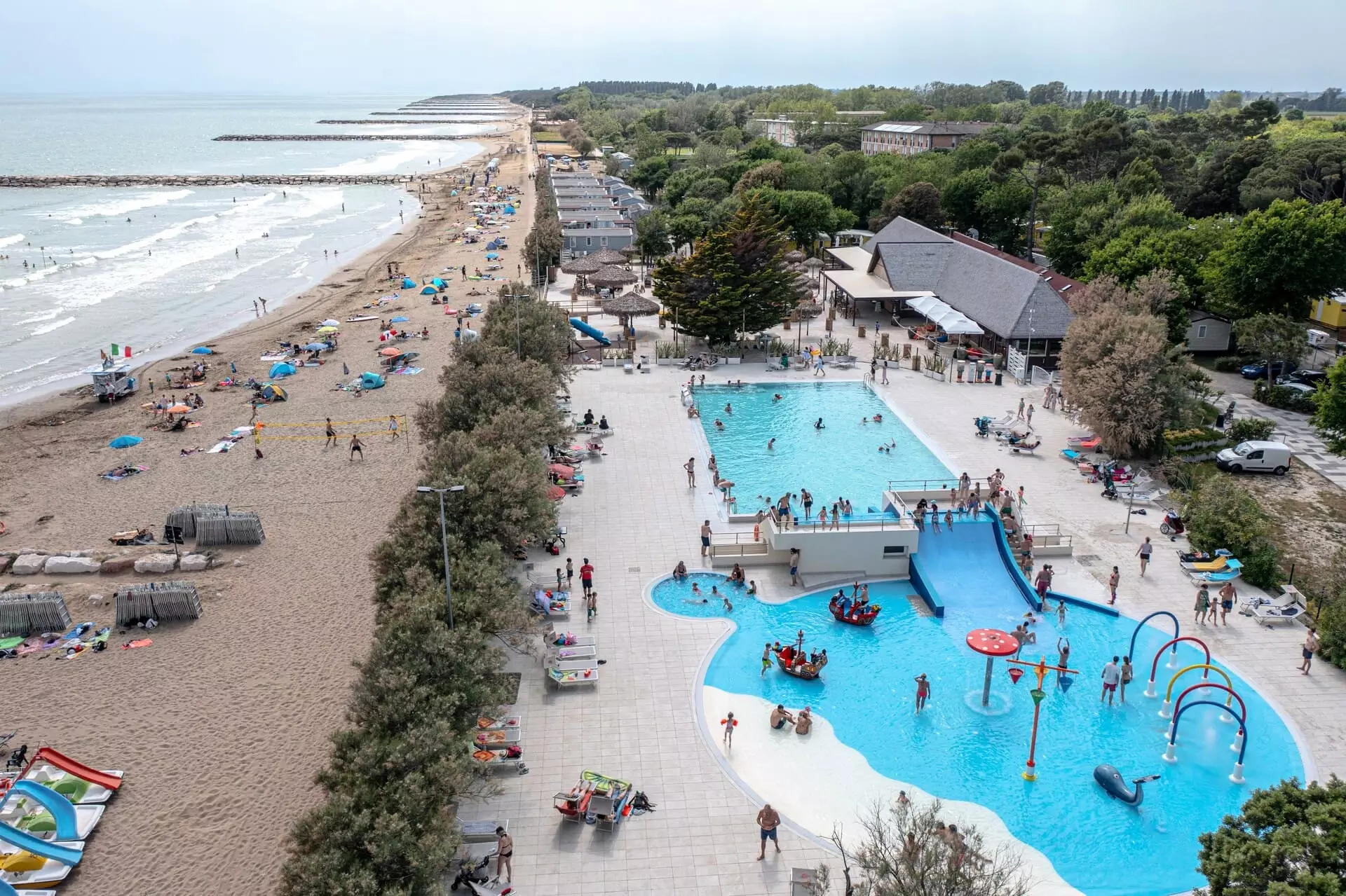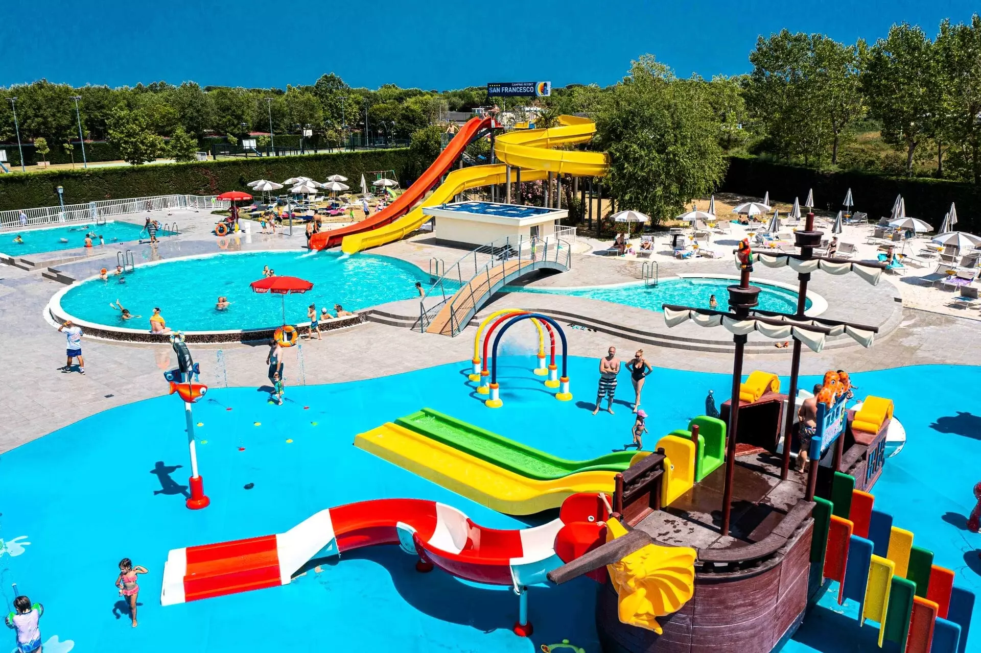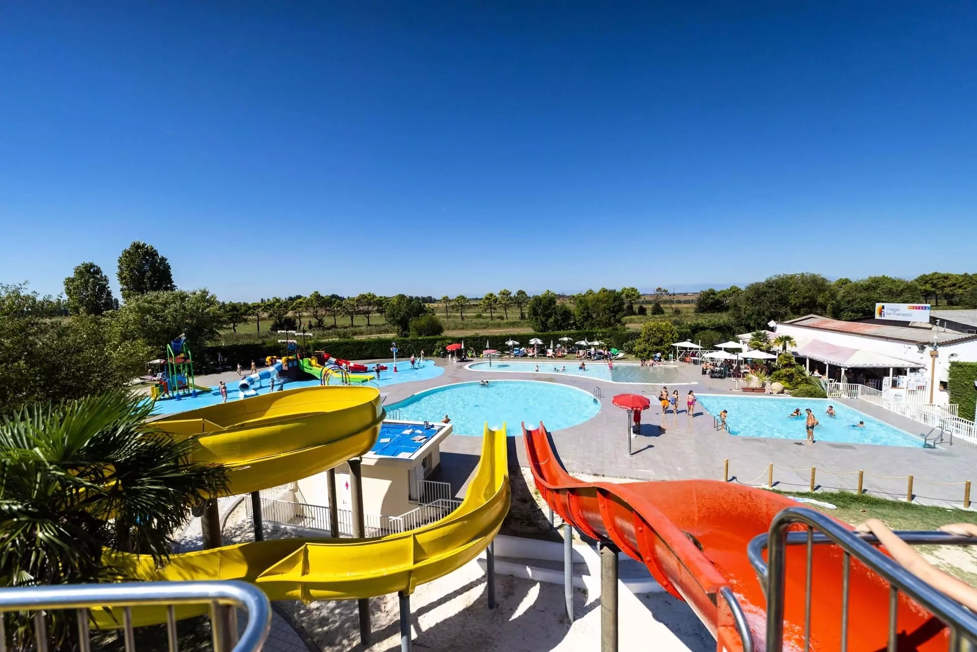 Le Centro Vacanze Villaggio San Francesco, classé 5 étoiles, est situé en bord de mer sur le littoral de la mer Adriatique. Il est niché dans une végétation méditerranéenne riche et typique avec des centaines d'arbres. Il est proche de Caorle, un village de pêcheurs singulier qui, avec son histoire, ses couleurs, ses saveurs et ses traditions, enveloppe d'une atmosphère d'antan. Le Centro Vacanze Villaggio San Francesco couvre une superficie plane de 320 000 m². Il dispose d'une plage privée et équipée, longue de plus de 500 m, avec du sable très fin. Nos unités d'habitation, au centre d'une grande oasis de verdure, sont disponibles pour des vacances inoubliables. Nos grandes parcelles ombragées sont équipées de systèmes d'eau, d'électricité et d'évacuation des eaux usées. Et en plus... 3 piscines d'eau douce pour adultes et enfants. Le Centre Aquatique Garden avec: hydromassage, cours de natation, 2 toboggans aquatiques, centre de fitness.