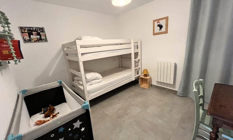 Une chambre avec deux lits superposés en 90 et un lit bébé,