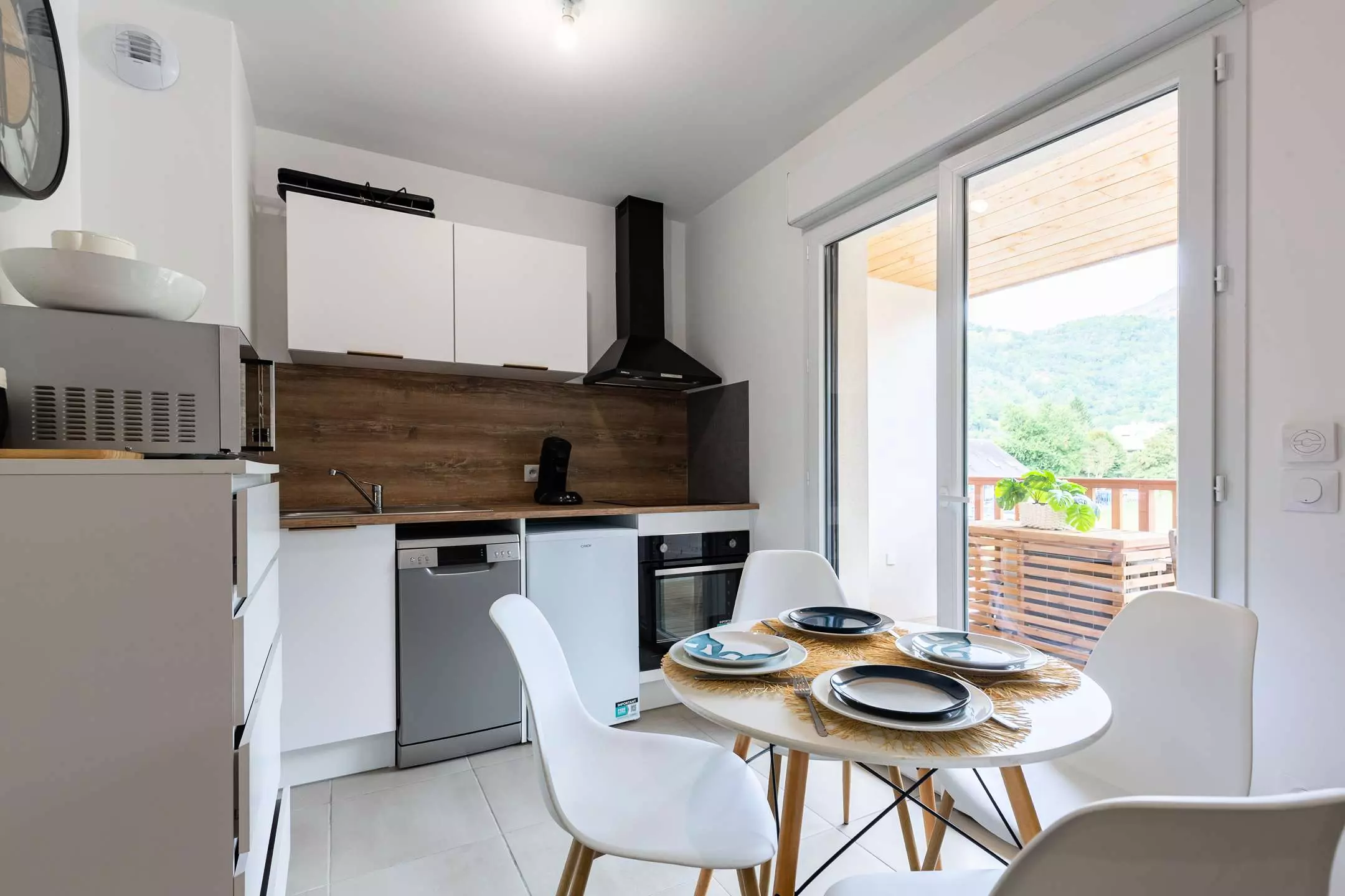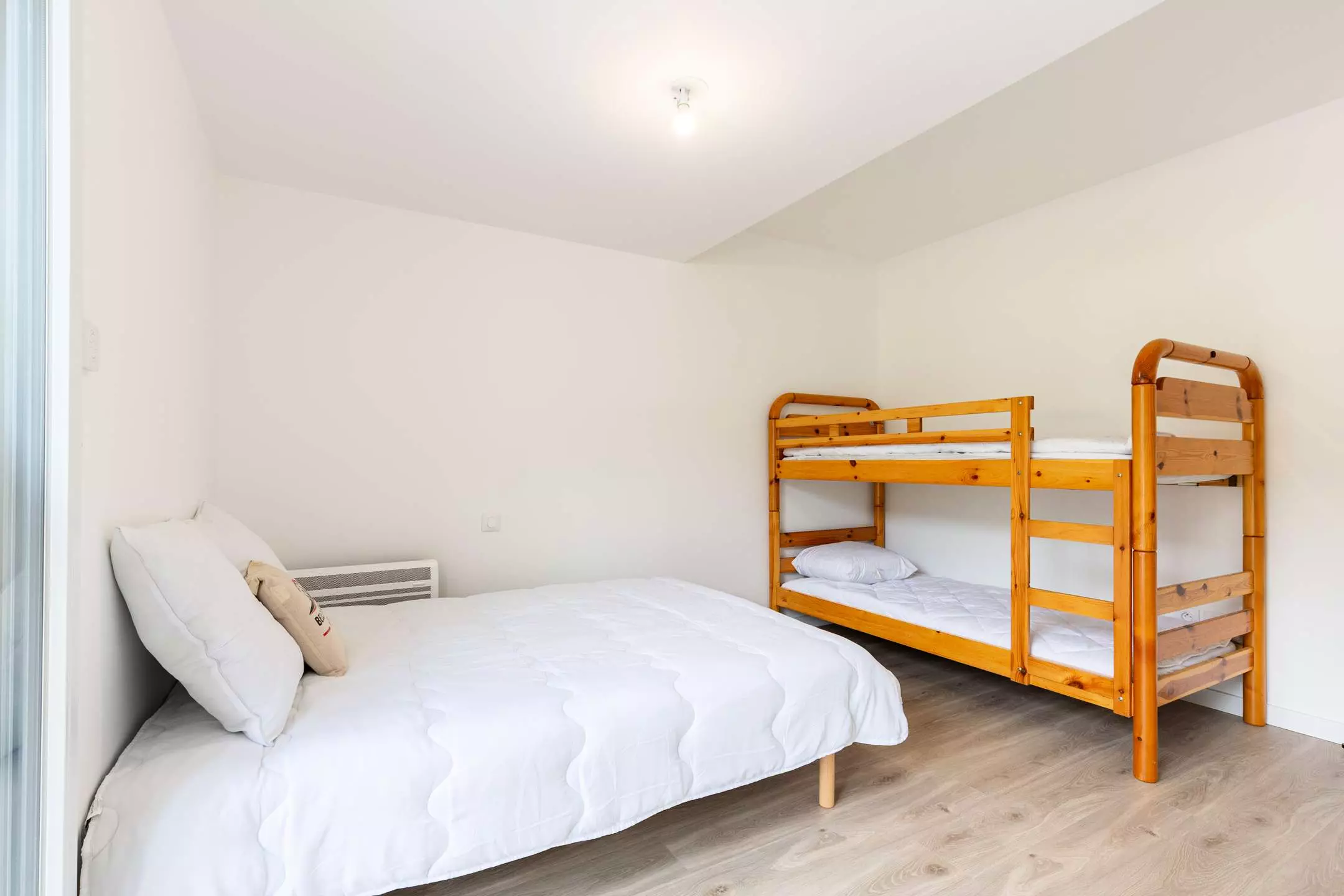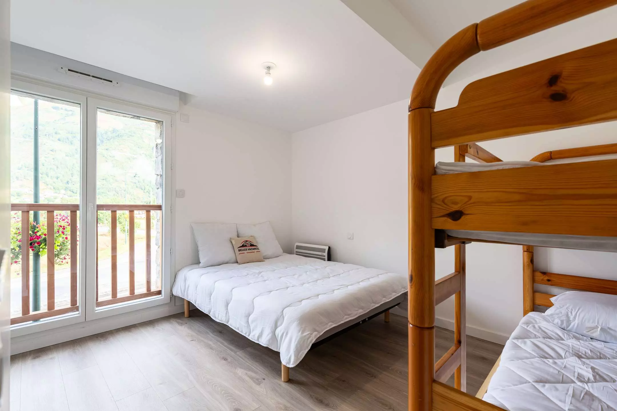 L'appartement peut accueillir jusqu'à 4 personnes grâce à une chambre équipée d'un lit double en 140 cm, deux lits superposés en 90 cm et un canapé convertible de 120 cm installé dans le séjour. Lumineux et convivial, l'espace de vie s'ouvre sur une terrasse offrant une vue imprenable sur les montagnes, parfaite pour se détendre après une journée de ski ou de randonnée.