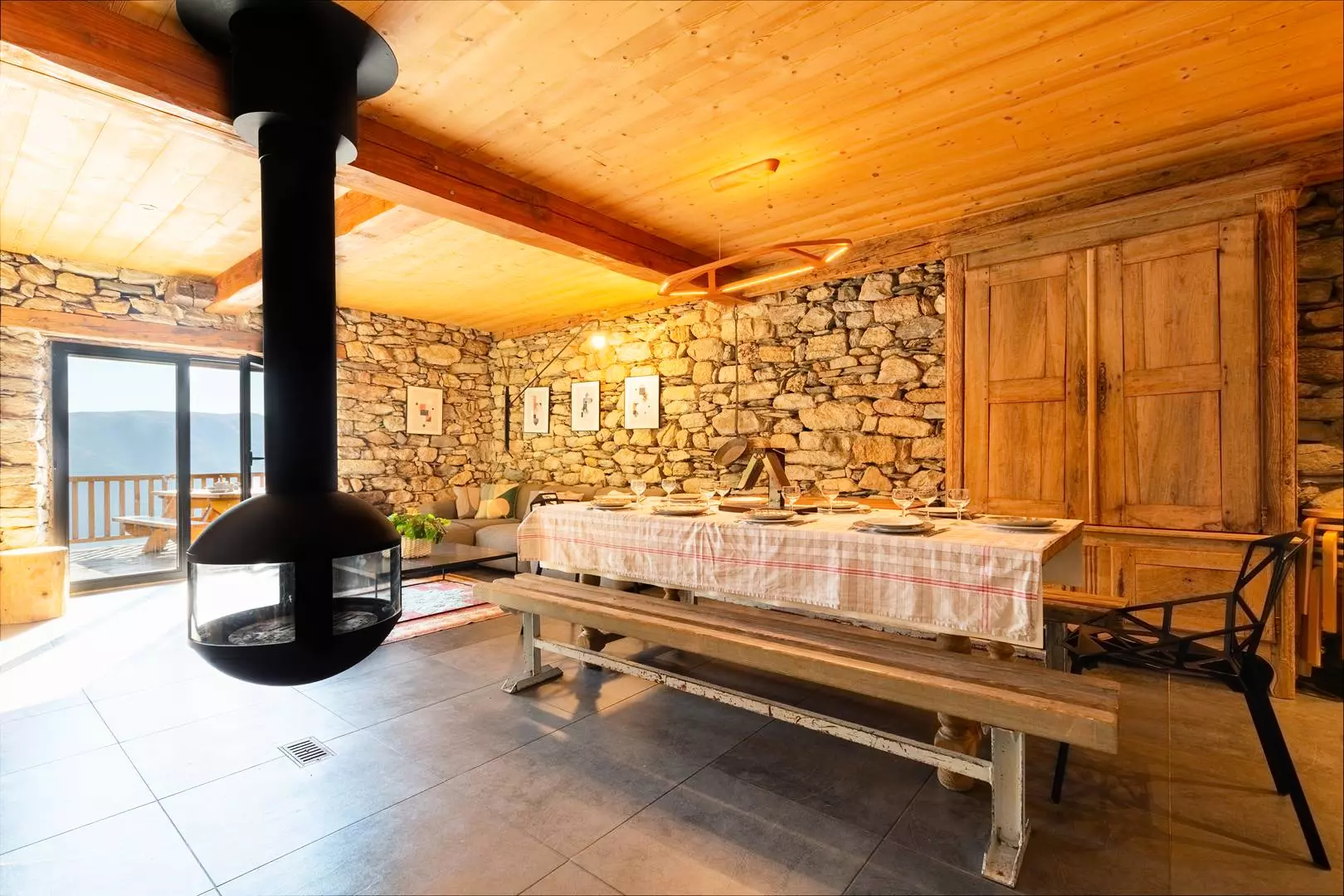 Terrasse exposée sud-est avec table et vue magnifique sur la vallée
