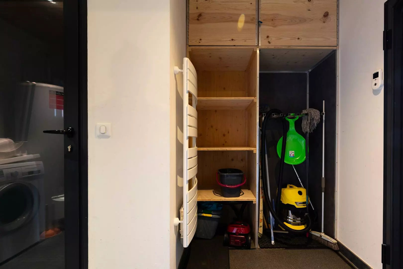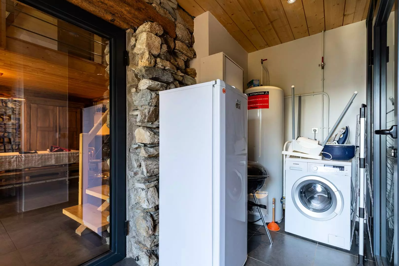 Sas d'entrée pratique avec machine à laver, espace de rangement et coin pour faire sécher skis et chaussures