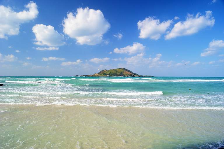 Superbe plage de Hyeopjae. Réputée pour son sable blanc et fin, la plage a également un arboretum de qualité à proximité. Pour profiter du soleil, de la mer et de la nature.