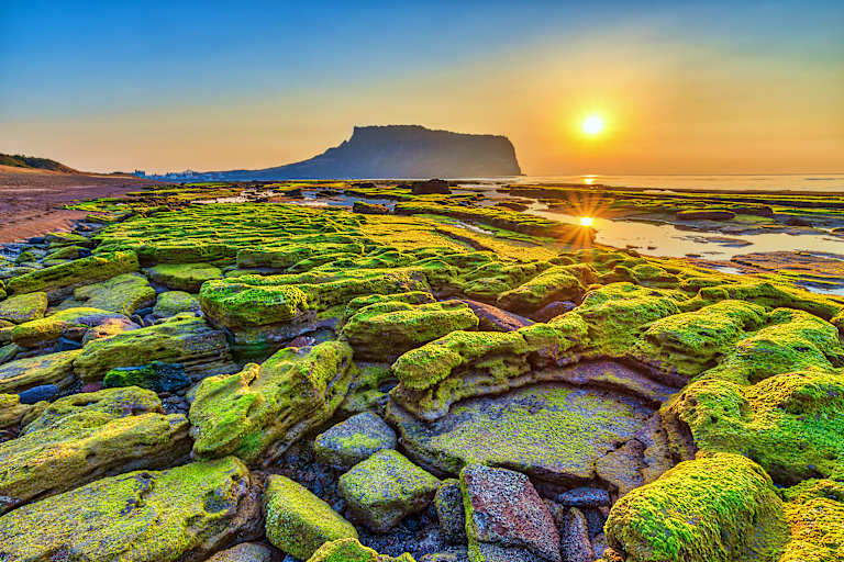 Pic du soleil levant Seongsan Ilchulbong (UNESCO). Unique exemple de formation volcanique en plein milieu du littoral, le pic est également unique pour observer (si la météo est clémente) le lever de soleil.