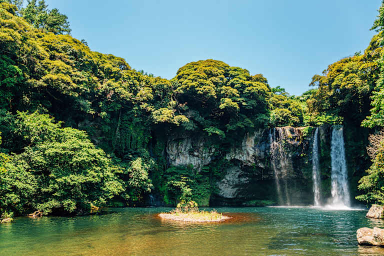 Zone de Jungmun avec les cascades Cheonjeyeon et Cheonjiyeon. Cette zone comporte 2 chutes d'eaux dont la vue vaut le détour. La légende dit que des nymphes viendraient s'y baigner les nuits de pleine lune.
