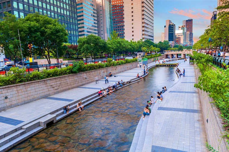 Rivière Cheonggyecheon, veine verte du cœur de Séoul. Cheonggyecheon a subi de gigantesques travaux durant son histoire moderne. Initialement une petite rivière, elle devint un bidonville à la fin de la guerre de Corée. Complètement détruite, elle laissa la place à un périphérique routier suspendu dans les années 70 avant de retrouver sa forme semi-originelle dans un chantier qui dura près de 2 ans et coûta la bagatelle de 300 millions de USD.