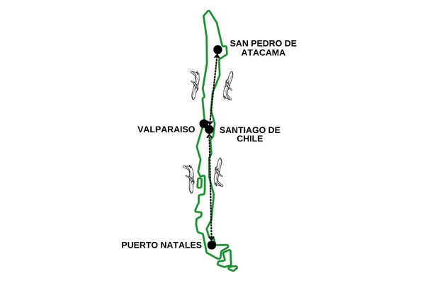 * Le nom de la compagnie aérienne et les horaires sont donnés à titre purement indicatif et vous seront communiqués définitivement à 8 jours du départ. Les compagnies opérant vers la Chili sont : Iberia, LATAM, Air France ou autres compagnies dont le nom vous sera communiqué à 8 jours du départ.
