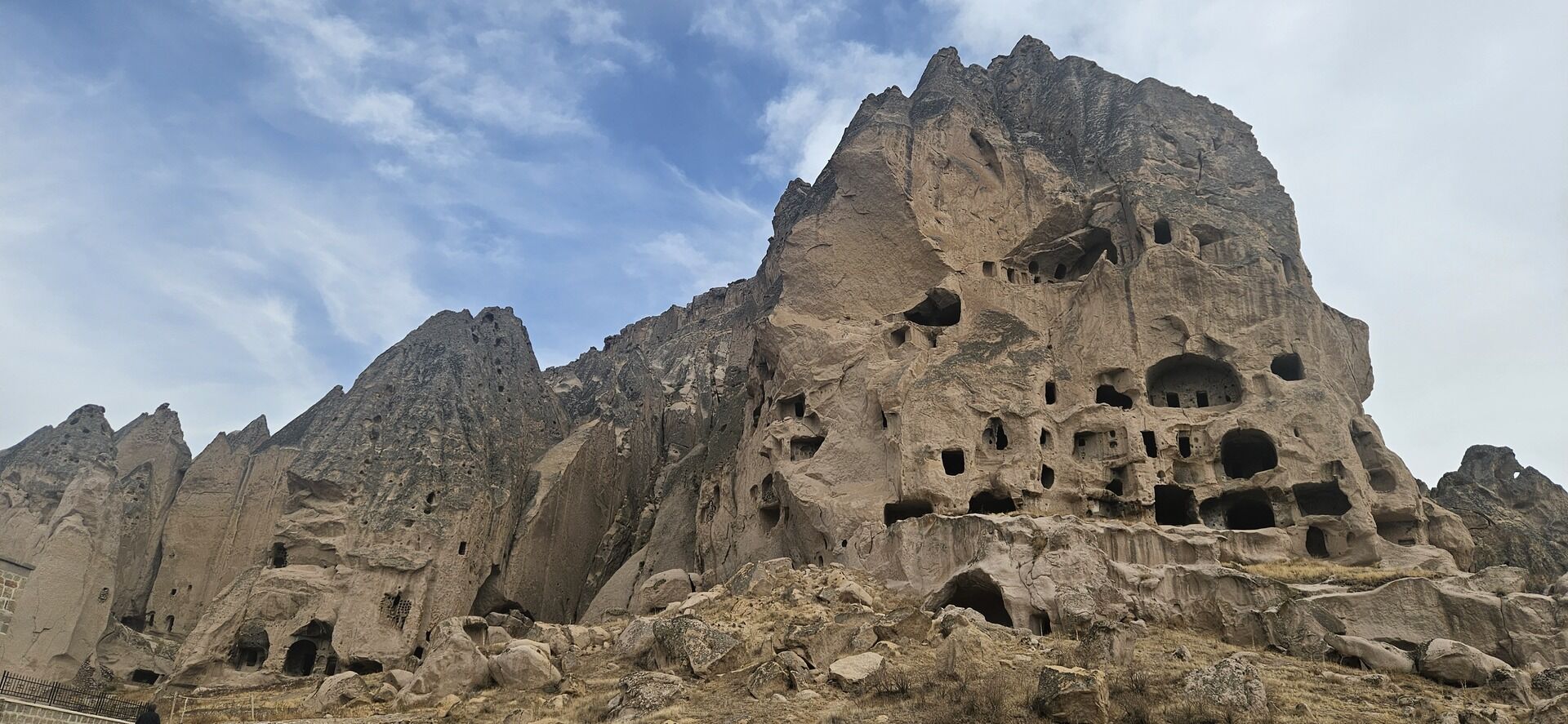 Arrêt Photo à Uçhisar célèbre grâce au Kale, son piton rocheux troglodytique visible à plusieurs kilomètres et percé de mille cavités. Uçhisar est le point culminant de la Cappadoce. La vue sur les vallons les plus impressionnants de Cappadoce est magnifique.