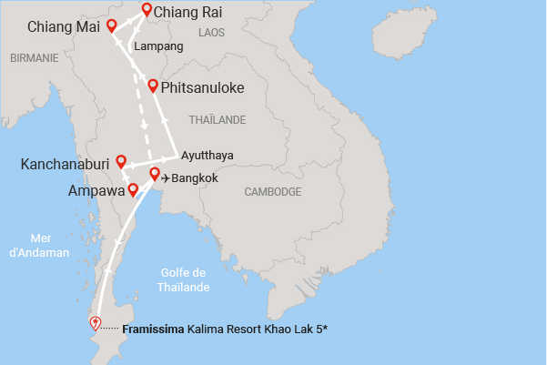 Partez à la découverte de la Thaïlande à travers un circuit captivant, mêlant histoire, culture et paysages époustouflants. Visitez Bangkok et ses sites emblématiques comme Wat Arun et le Grand Palais, puis plongez dans l'histoire à la rivière Kwai et à Ayutthaya. Explorez les trésors de Sukhothai, Chiang Mai et Chiang Rai, avec une expérience unique auprès des éléphants. Découvrez le Triangle d'Or et profitez d'une journée libre à Bangkok. À l'issue de votre aventure, prolongez votre séjour avec une extension à l'hôtel Kalima, pour un moment de détente. Un voyage riche en découvertes et émotions, la Thaïlande a tant à vous offrir !
